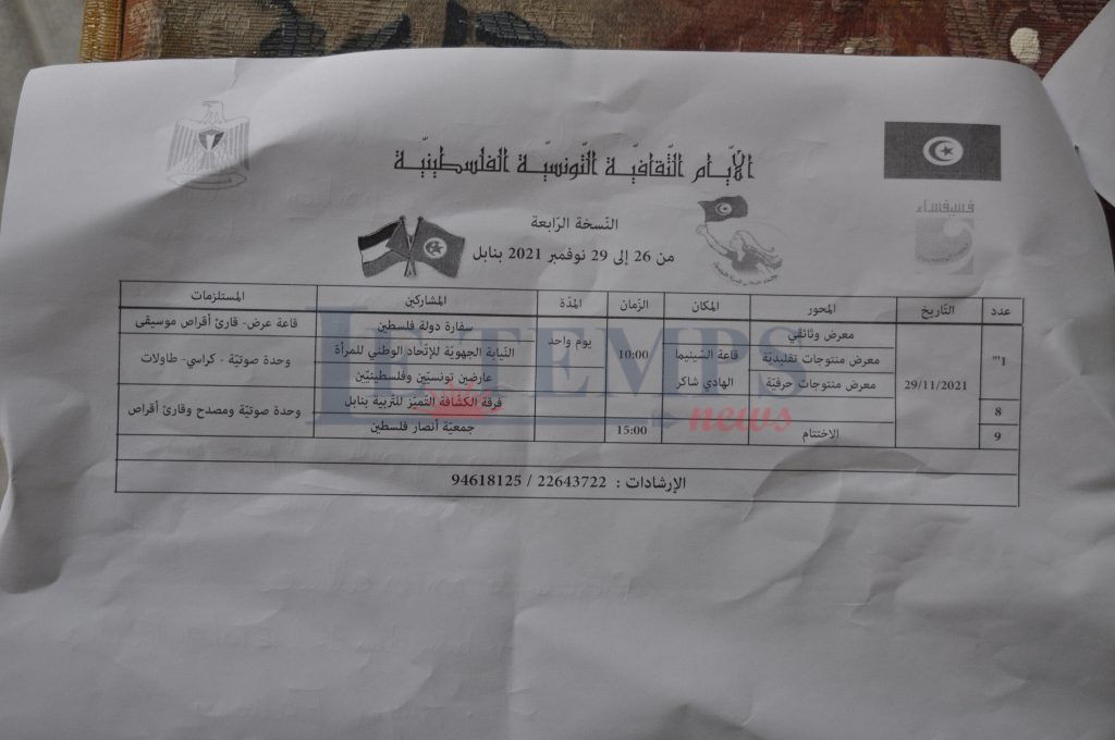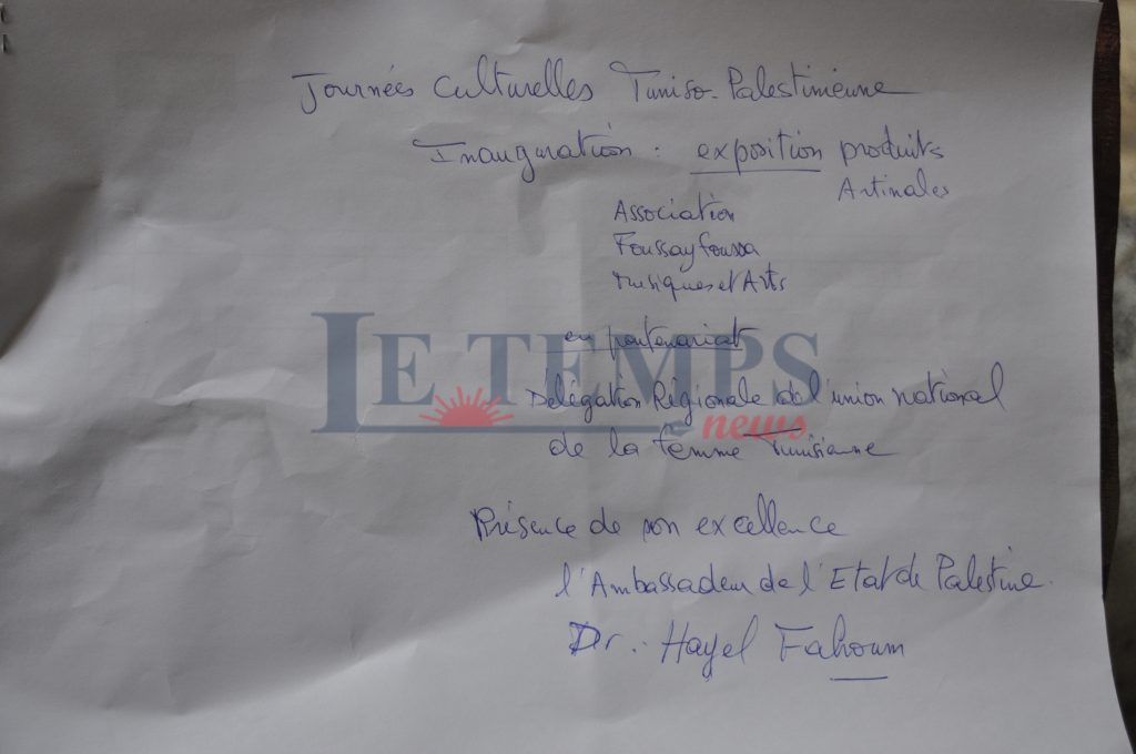 Faycal Gabsi, président de l’Association Foussay foussa, a indiqué que l’organisation de cette manifestation est « une preuve de notre considération et notre solidarité avec le peuple palestinien qui résiste avec courage et défend sa terre ». Cette manifestation, a-t-il affirmé, vise à faire connaître le potentiel culturel que recèle la Palestine et à exprimer les liens historiques et civilisationnels entre les deux peuples,