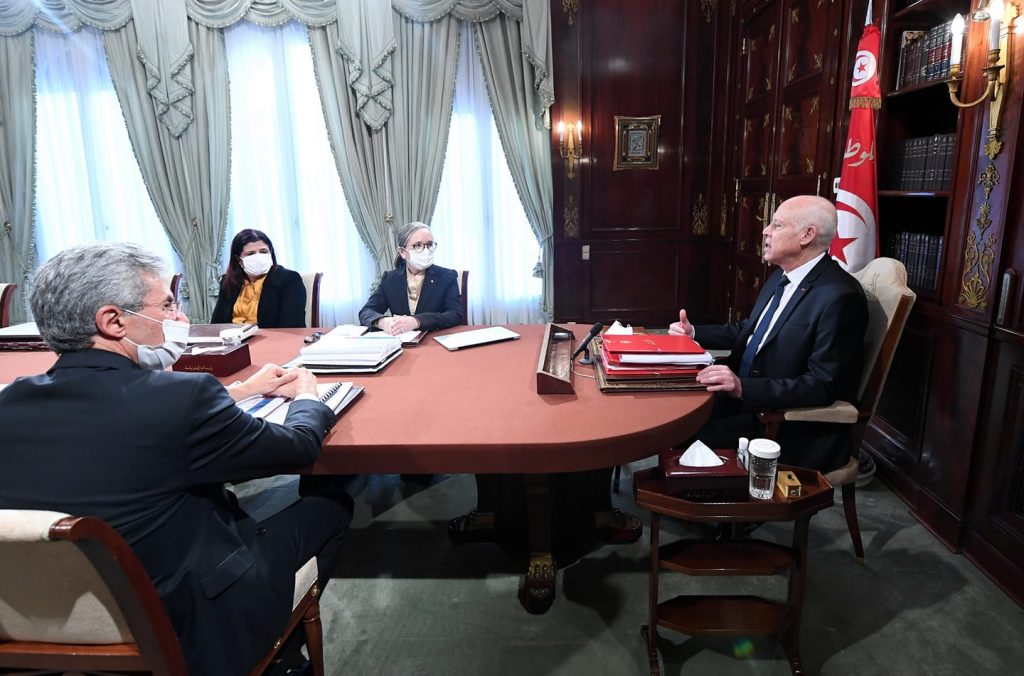 Le Président de la République, Kais Saïed a présidé, mercredi 22 décembre 2021 au palais de Carthage, une réunion ministérielle restreinte, en présence de la Cheffe du gouvernement Najla Bouden, la ministre des Finances Sihem Boughdiri Nemsia et le ministre de l’Economie et de la planification, Samir Saïed, pour discuter le projet de budget de l’Etat, la loi des Finances et la balance économique pour l’exercice 2022.