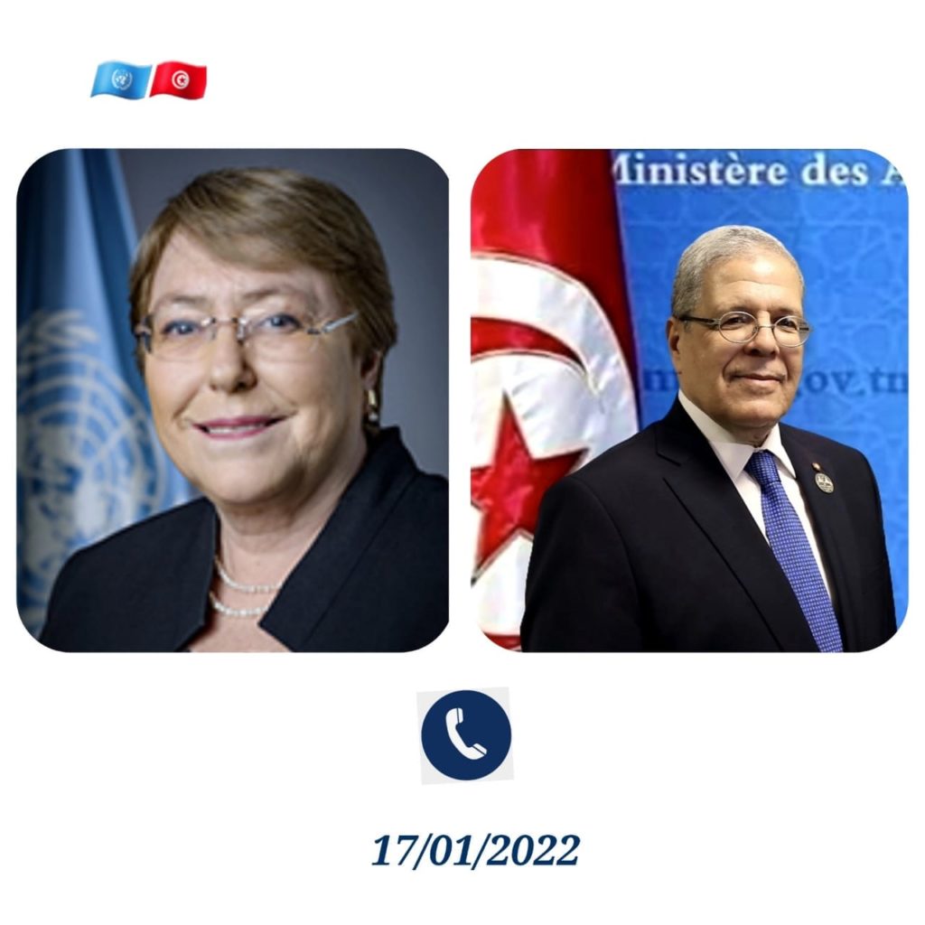 Le renforcement du processus démocratique en Tunisie et la garantie des droits et libertés ont été au centre d’un entretien téléphonique, lundi soir, 17 janvier 2022, entre le ministre des Affaires étrangères, de la migration et des Tunisiens à l’étranger, Othman Jerandi et la Haute- Commissaire des Nations Unies aux droits de l’homme Michelle Bachelet.