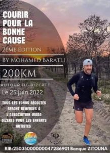 Pour le président Belkhiria, ce challenge de courir 200 Km sera certainement un important soutien à l’autisme, à travers les parents des enfants, les amis et les associations qui vont contribuer à l’achat des bons de soutien de 5 à 20 dinars. Ces fonds qui seront récoltés lors de cette nouvelle édition, iront à l’association « IRADA » qui met tout en œuvre pour rendre le quotidien des enfants autistes meilleurs. Notre objectif, cette année, est de contribuer à la construction du premier centre en faveur des enfants autistes à Bizerte, dans la perspective de venir en aide à tant de parents et d’enfants. Et Belkhiria de poursuivre: « je compte énormément sur la générosité de nos concitoyens. Ensemble nous avons commencé à écrire les pages d’une belle histoire qui a pour but de mettre un peu de chaleur et de réconfort à tous ceux qui en ont le plus besoin. Ensemble nous continuons à semer un peu de joie et de bonheur. Merci pour votre soutien »