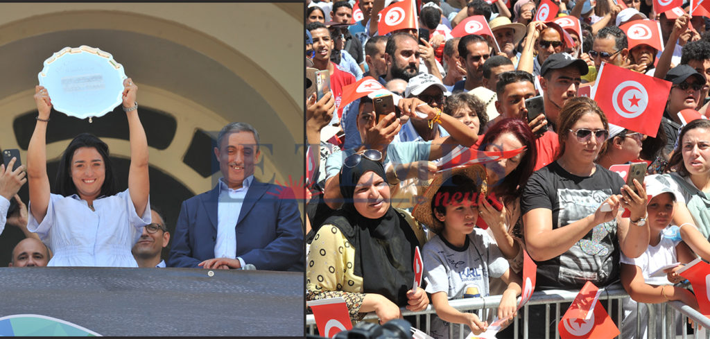 Après cette rencontre avec les médias, Ons Jabeur est montée au dernier étage du Théâtre Municipal de Tunis pour apparaitre aux yeux du large public qui était présent depuis le petit matin à l’Avenue Habib Bourguiba, malgré la chaleur, ce qui a fait dire à Ons Jabeur : « Pardonnez-moi de vous avoir laissé attendre sous ce soleil brûlant’.