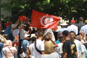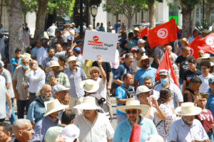 Focus en photos sur la manifestation du camp des « boycotteurs », organisée ce samedi 23 juillet 2022 sur l’Avenue Habib Bourguiba dans la Capitale, par un certain nombre d’activistes islamistes et des militants du parti Ennahdha et de ses différentes « orbites » (Front de salut national, Coalition Al Karama, Citoyens contre le coup d’état, etc…), qui ont manifesté contre le Président de la République Kaïs Saïed et appelé à boycotter le référendum du lundi 25 juillet.