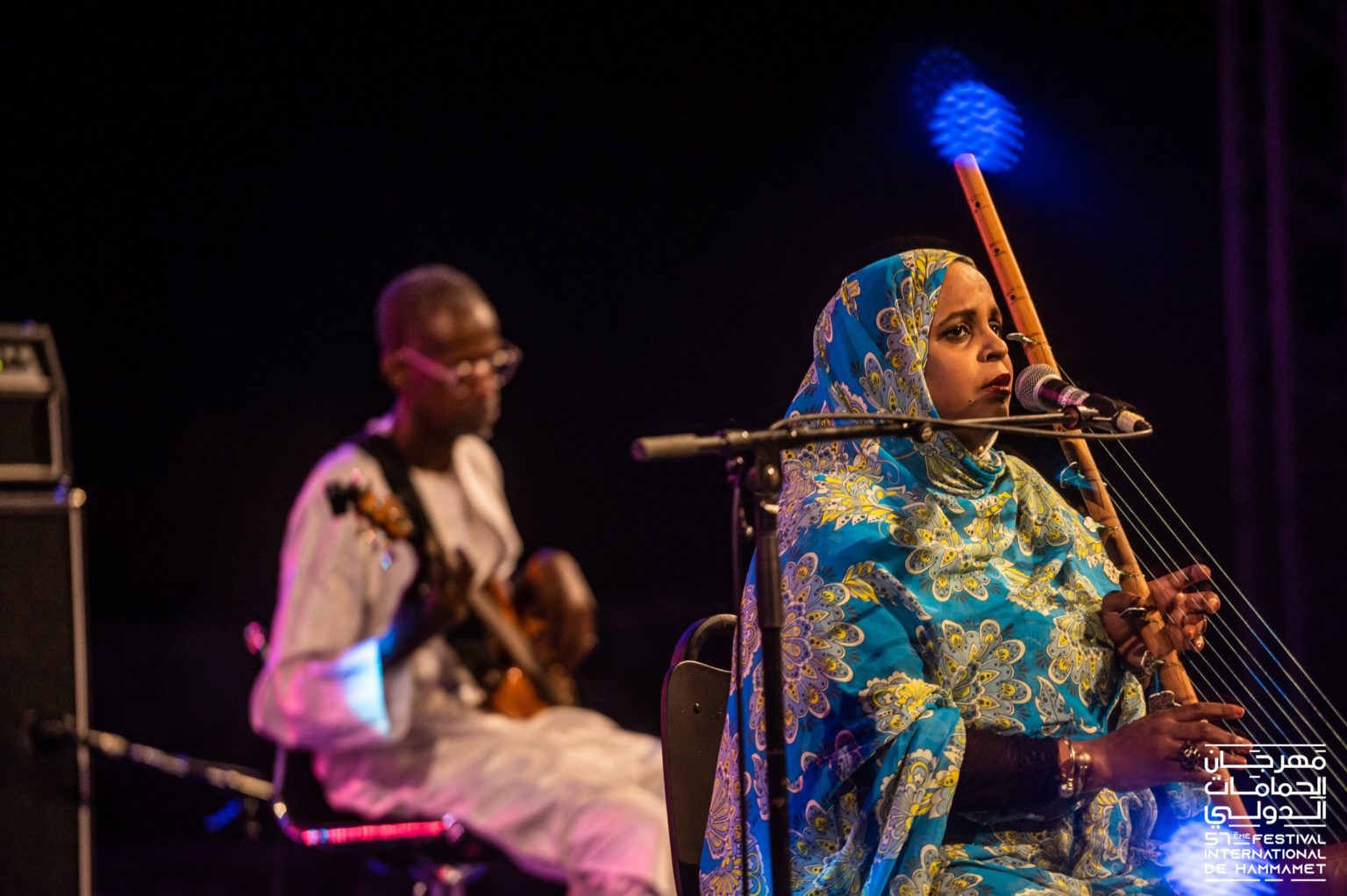 L’auteure-compositrice et instrumentaliste griotte mauritanienne Noura Mint Seymali et le chanteur tunisien Nidhal Yahyaoui avec son projet « Masreb El Hattaya » ont enchanté le public hammamettois. La soirée s’est démarrée avec Noura Mint Seymali avec son « Ardin » (un instrument principalement utilisé par les griottes mauritaniennes), accompagnée d’El Jeich Chighaly à la guitare, Ousmane Touré à la basse et Matthew Tinari à la batterie, elle a proposé un répertoire tiré de l’héritage culturel du Sahara Occidental. En mélange entre du Rock et du Groove, le tout enveloppé d’une musique ancestrale mauritanienne, les mélodies émises par Noura Mint Seymali et son groupe, la ténacité de sa voix et leur style vestimentaire typiquement mauritanien, étaient un voyage ébranlant pour tous ceux qui étaient face à la scène.