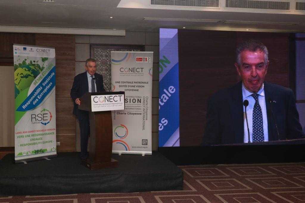 La Confédération des Entreprises Citoyennes de Tunisie -CONECT-a dévoilé l’évolution de son Label RSE vers une nouvelle version, dans le cadre du projet Cluster4Green mis en œuvre par le programme ENI CBC MED et le financement de l’UE, et ce, lors de la 9éme édition de la Conférence Internationale sur la RSE, organisée le 08 Novembre 2023 à l’Hôtel Laico Tunis, sur le thème « Label RSE-CONECT Nouvelle Version : Vers une reconnaissance engagée Responsibility Europe ».