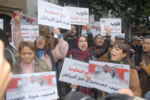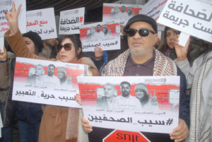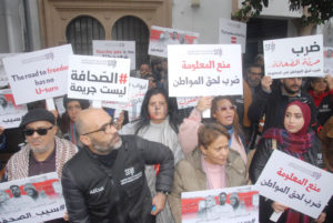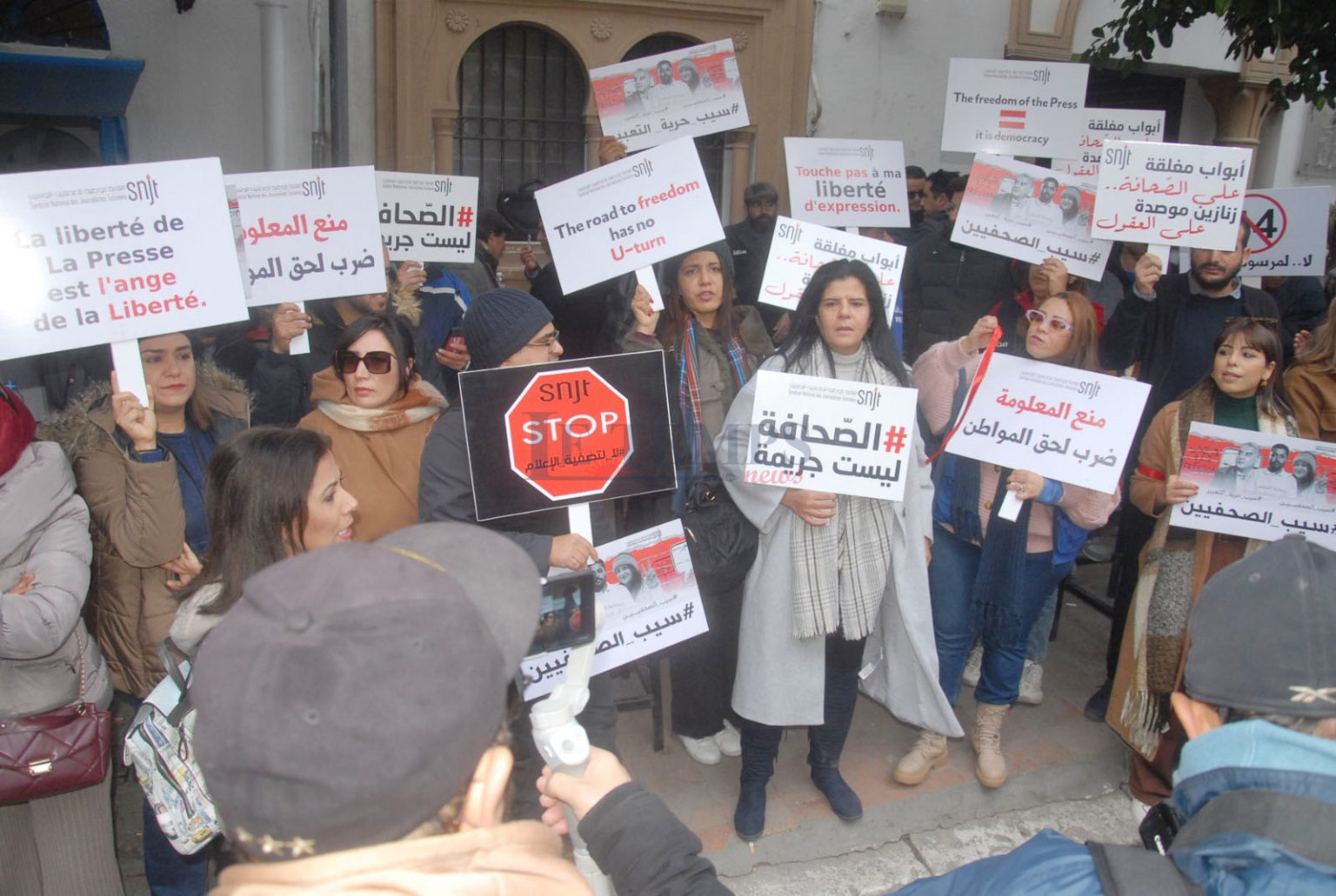 Les participant.e.s à cette mobilisation dirigée par le SNJT ont revendiqué la libération des journalistes détenus et la cessation de l’usage des mesures législatives décrites comme attentatoires à liberté de la presse et de l’expression.