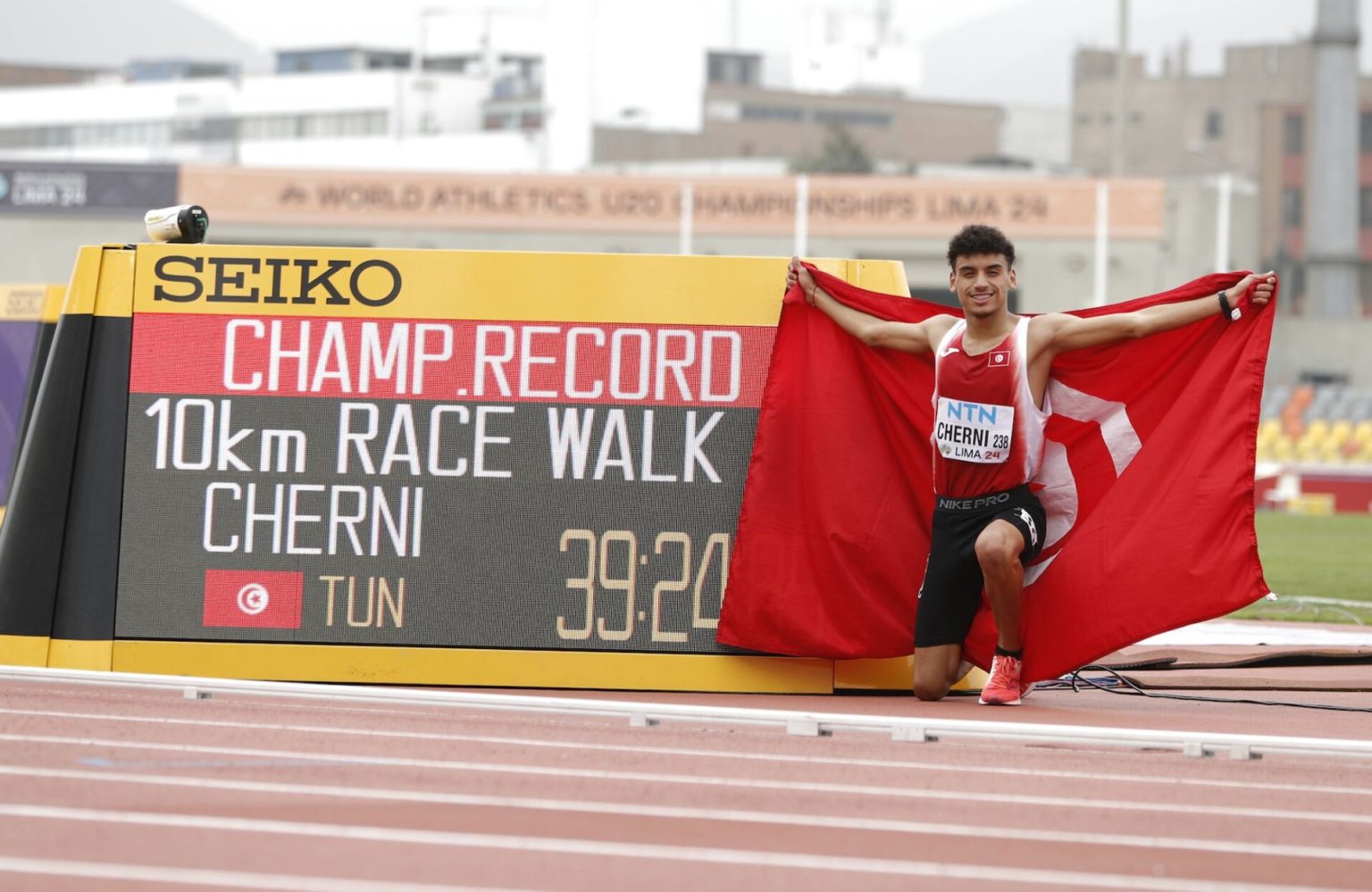 L’athlète tunisien Rayen Cherni a été sacré champion du monde du 10.000 m marche juniors, en remportant l’épreuve en 39’24’’85, hier, aux Mondiaux d’athlétisme U20, organisés à Lima, au Pérou.
