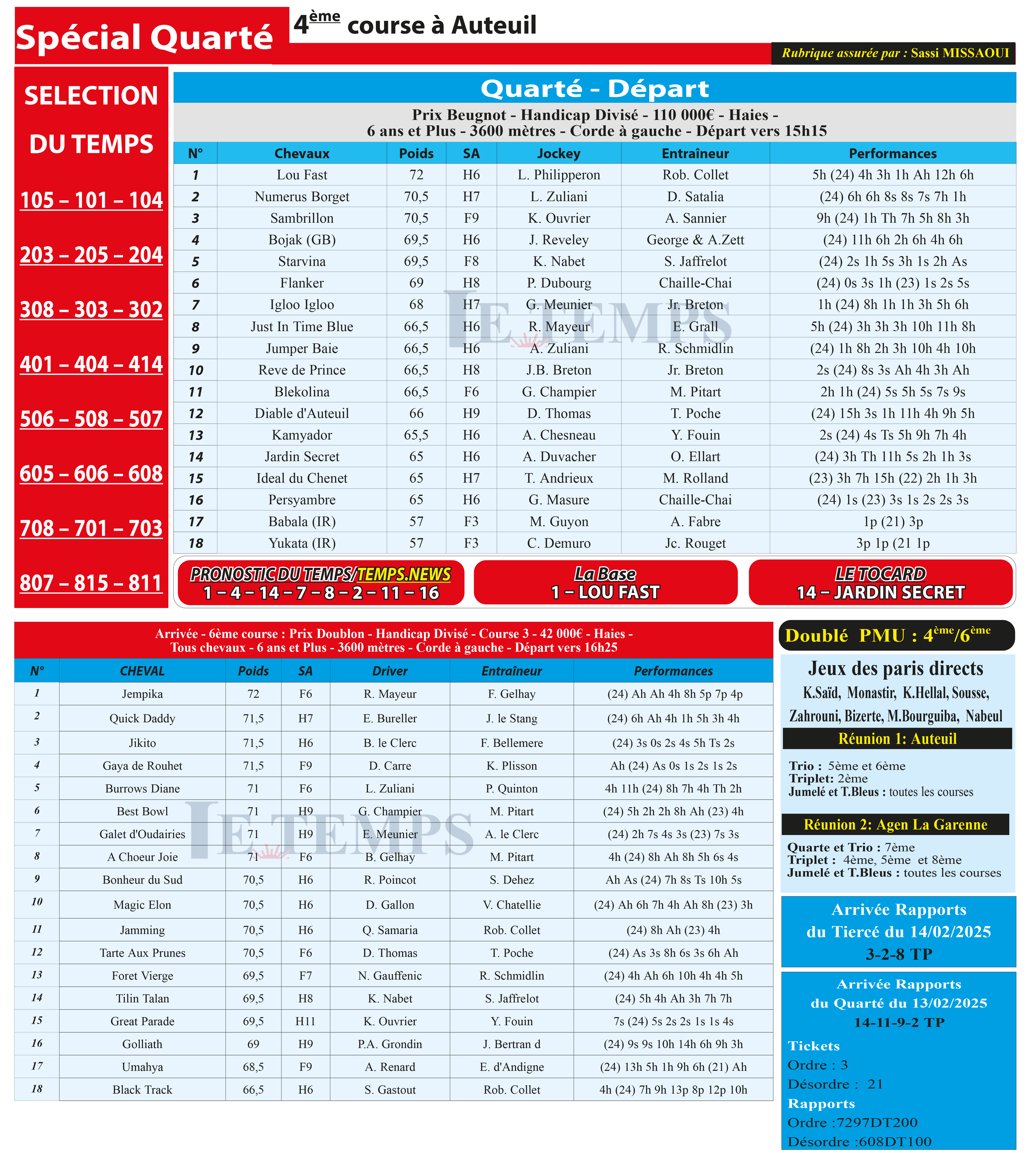Notre spécial Quarté d’aujourd’hui, 4ème course à Auteuil, donne notre pronostic du Temps/ Temps News avec le cheval n°1 Lou Fast étant la base, tandis que le Tocard est le cheval n°14 Jardin Secret.