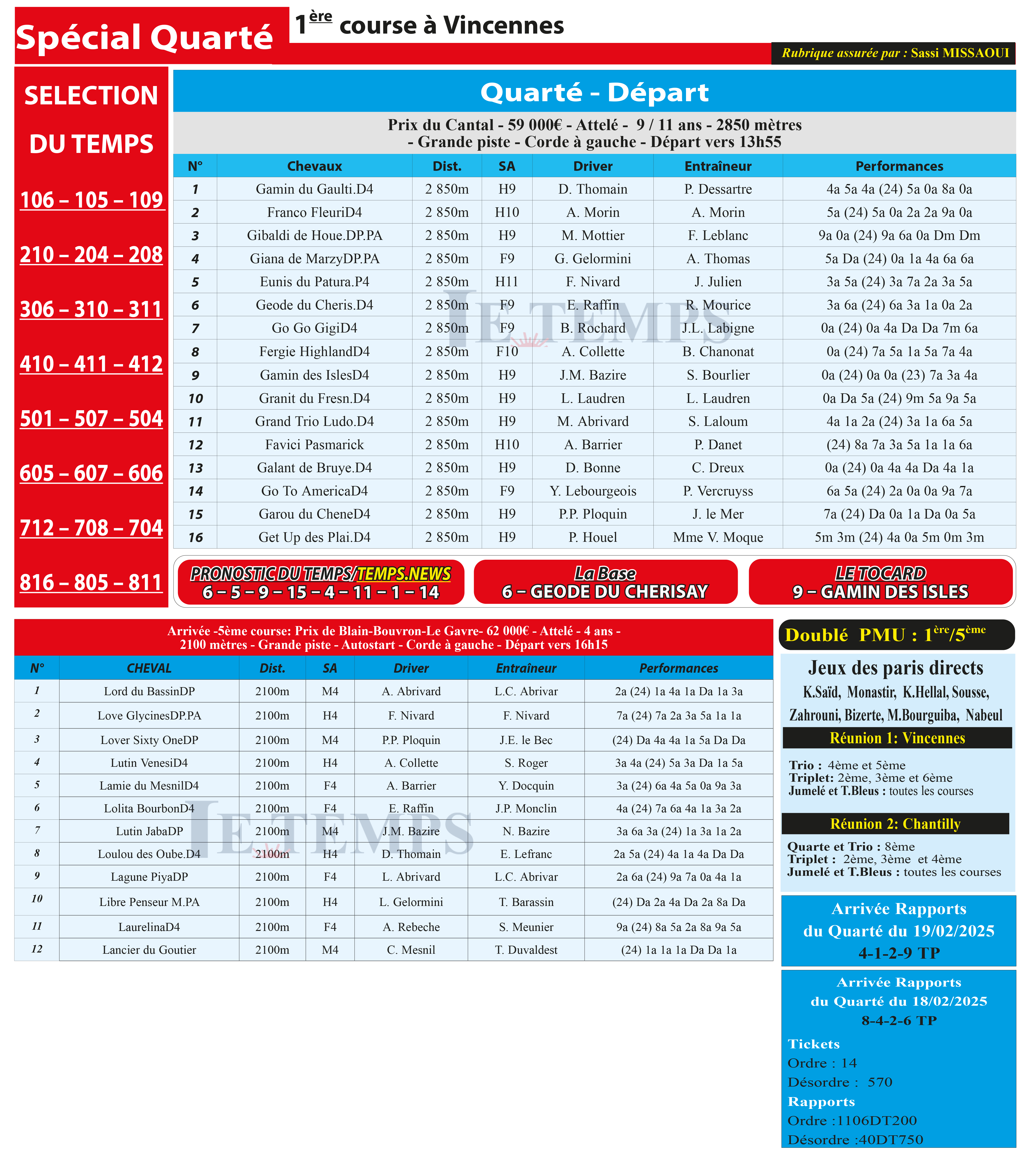 Notre spécial Quarté d’aujourd’hui, 1ère course à Vincennes, donne notre pronostic du Temps/ Temps News avec le cheval n°6 Geode du Cherisay étant la base, tandis que le Tocard est le cheval n°9 Gamin Des Isles.