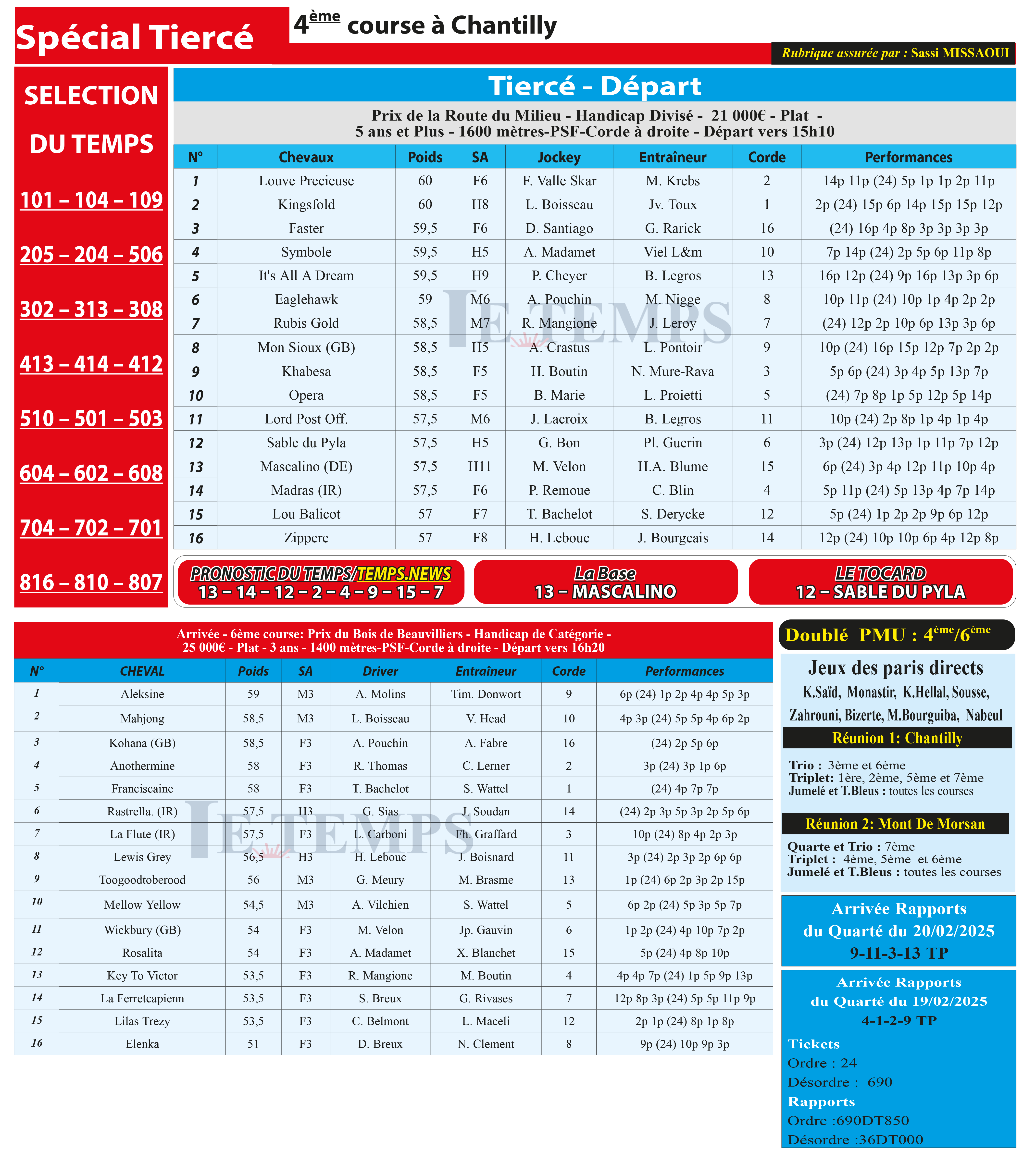 Partager Facebook Twitter LinkedIn Pinterest Email Notre spécial Tiercé d’aujourd’hui, 4ème course à Chantilly, donne notre pronostic du Temps/ Temps News avec le cheval n°13 Mascalino étant la base, tandis que le Tocard est le cheval n°12 Sable Du Pyla. PMU Turf