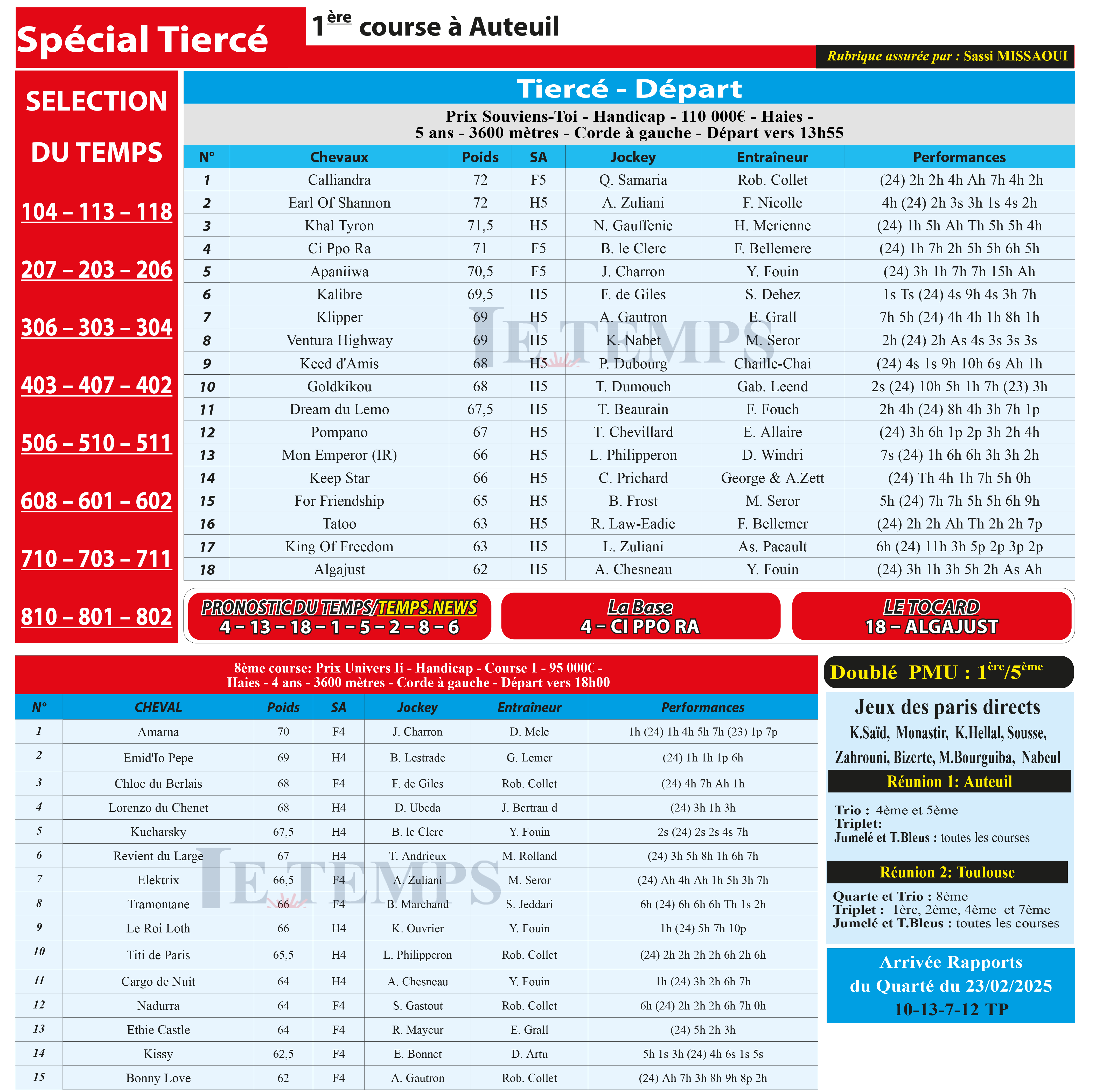 Notre spécial tiercé d’aujourd’hui, 1ère course à Vincennes, donne notre pronostic du Temps/ Temps News avec le cheval n°4 Ci Ppo Ra étant la base, tandis que le Tocard est le cheval n°18 Algajust.