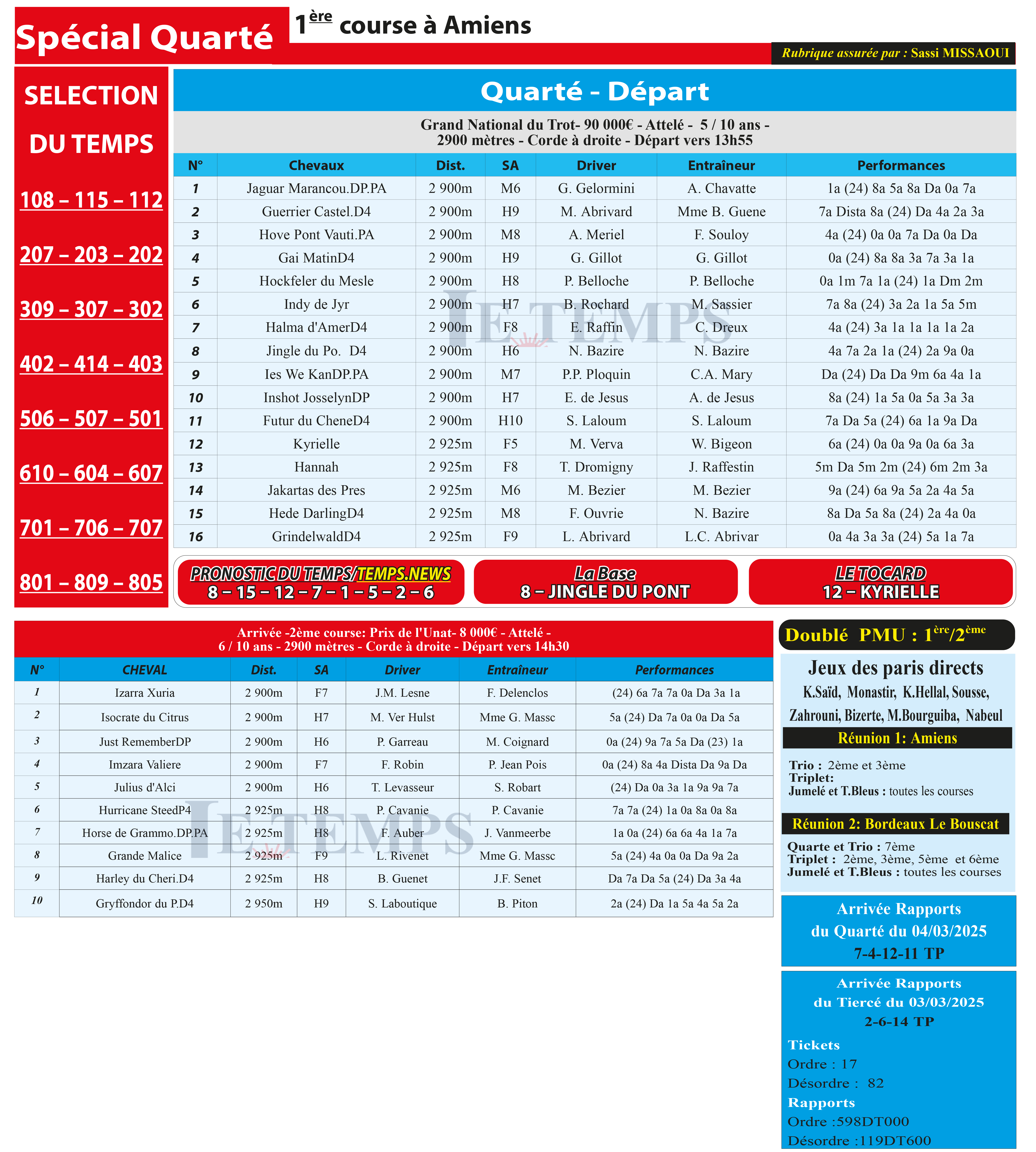 Partager Facebook Twitter LinkedIn Pinterest Email Notre spécial Quarté d’aujourd’hui, 1ère course à Amiens, donne notre pronostic du Temps/ Temps News avec le cheval n°8 Jingle Du Pont étant la base, tandis que le Tocard est le cheval n°12 Kyrielle. PMU Turf