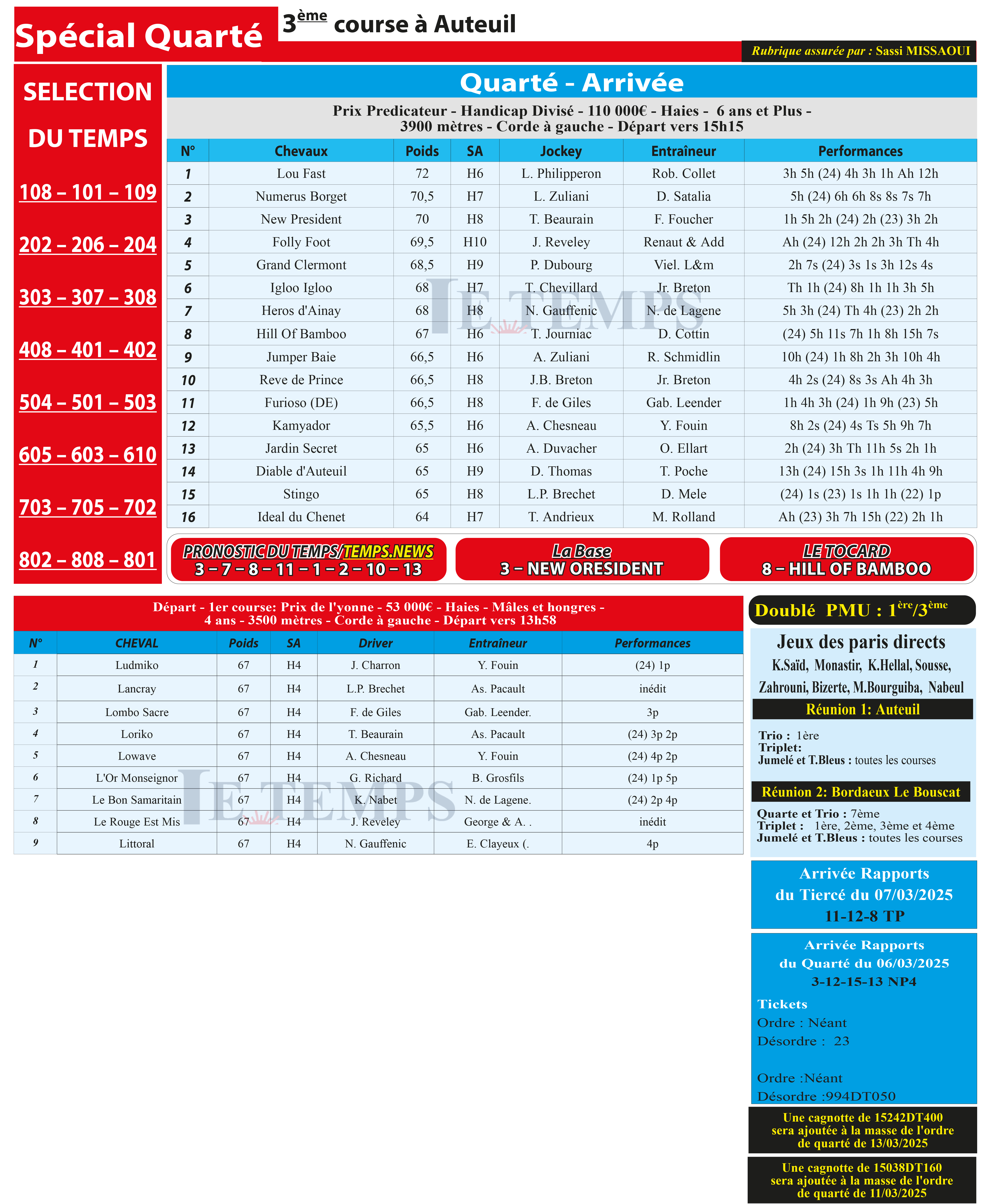 Partager Facebook Twitter LinkedIn Pinterest Email Notre spécial Quarté d’aujourd’hui, 3ème course à Auteuil, donne notre pronostic du Temps/ Temps News avec le cheval n°3 New Oresident étant la base, tandis que le Tocard est le cheval n°8 Hill Of Bamboo. PMU Turf