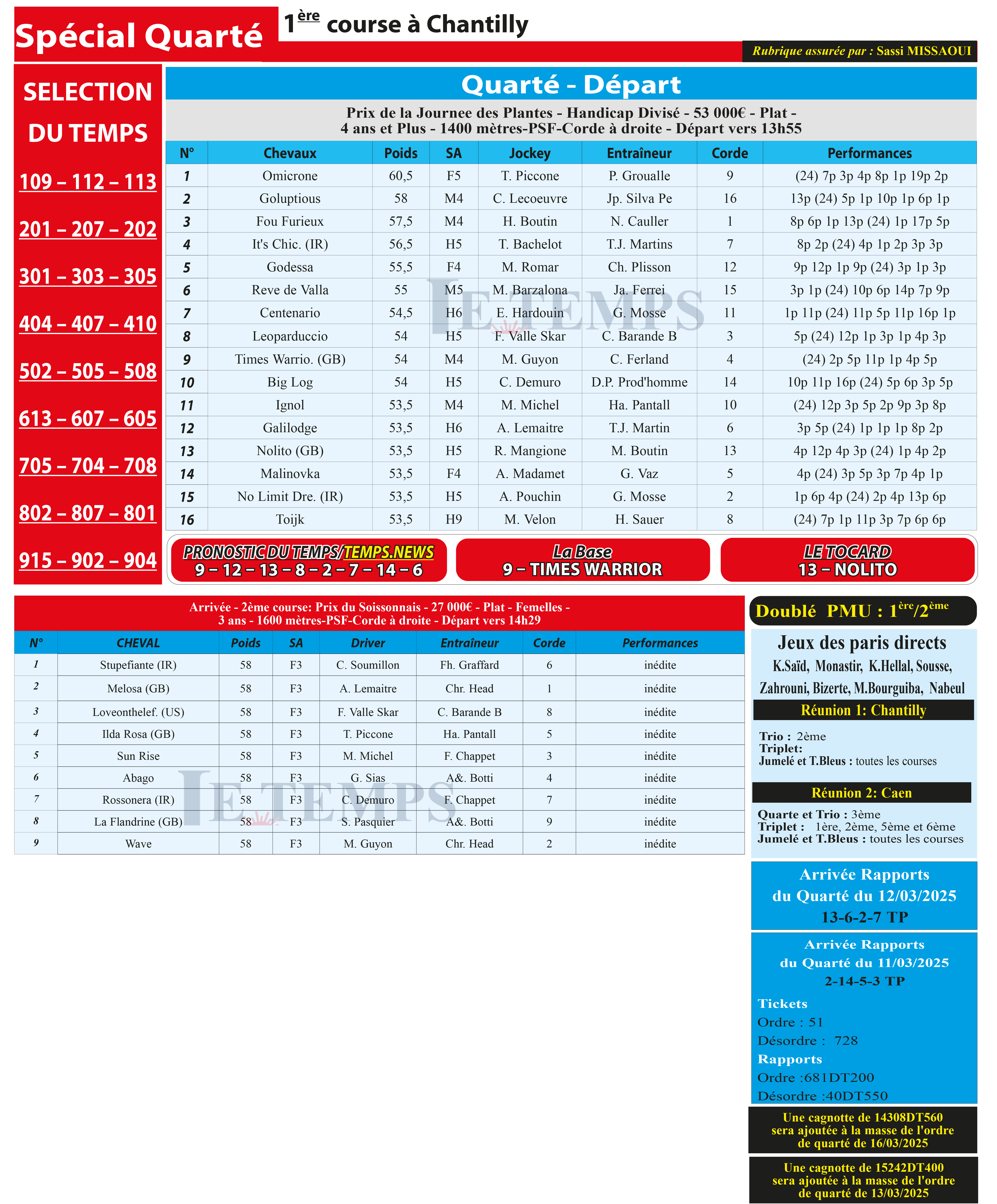 Partager Facebook Twitter LinkedIn Pinterest Email Notre spécial Quarté d’aujourd’hui, 1ère course à Chantilly, donne notre pronostic du Temps/ Temps News avec le cheval n°9 Times Warrior étant la base, tandis que le Tocard est le cheval n°13 Nolito. PMU Turf