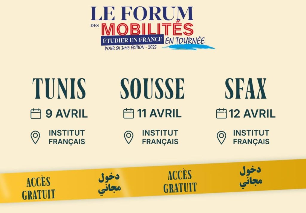 Pour sa 3ᵉ édition, ce Forum des Mobilités revient avec un nouveau format : une tournée dans 3 villes : 9 avril à Tunis, le 1 avril à Sousse et le 12 avril à Sfax. Organisé par Campus France Tunisie, service de l’Institut français et opérateur de coopération de l’Ambassade de France, ce forum est l’occasion idéale de découvrir les opportunités d’études supérieures en France et de bénéficier d’un accompagnement pour construire votre projet de mobilité académique.