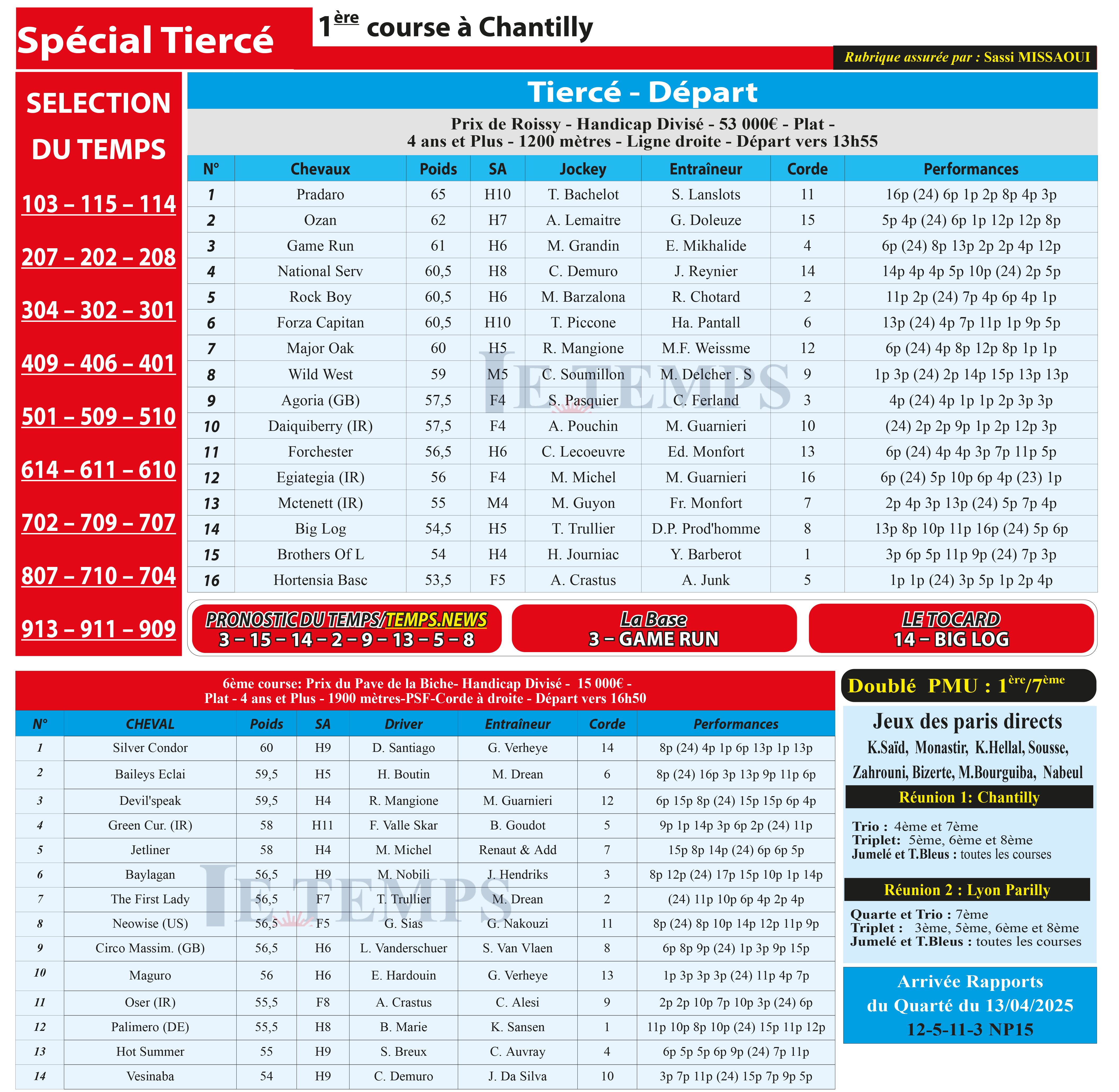 Partager Facebook Twitter LinkedIn Pinterest Email Notre spécial Tiercé d’aujourd’hui, 1ère course à Chantilly, donne notre pronostic du Temps/ Temps News avec le cheval n°3 Game Run la base, tandis que le Tocard est le cheval n°14 Big Log. PMU Turf