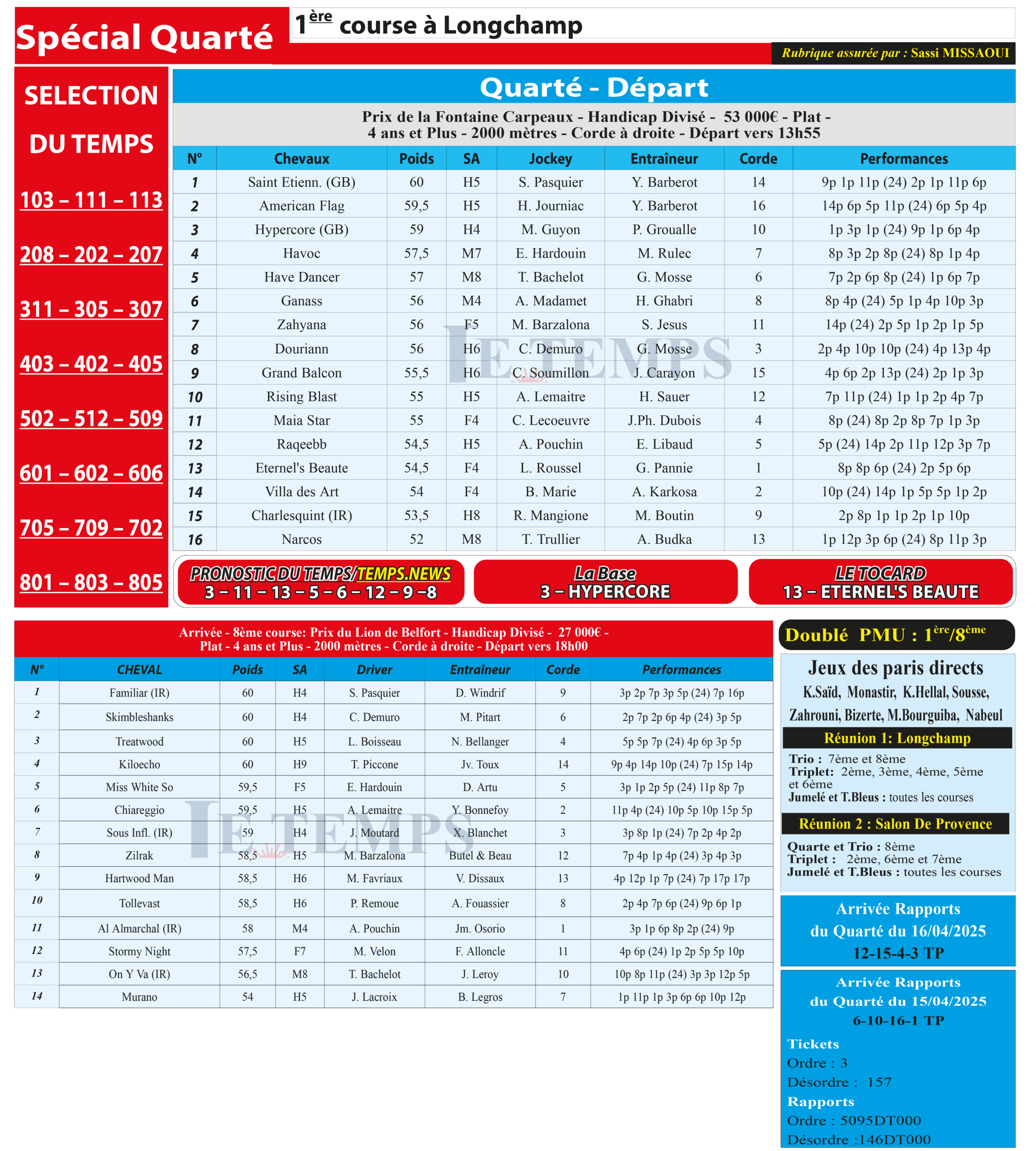 Partager Facebook Twitter LinkedIn Pinterest Email Notre spécial Quarté d’aujourd’hui, 1ère course à Longchamp, donne notre pronostic du Temps/ Temps News avec le cheval n°3 Hypercore étant la base, tandis que le Tocard est le cheval n°13 Eternel’s Beaute. PMU Turf