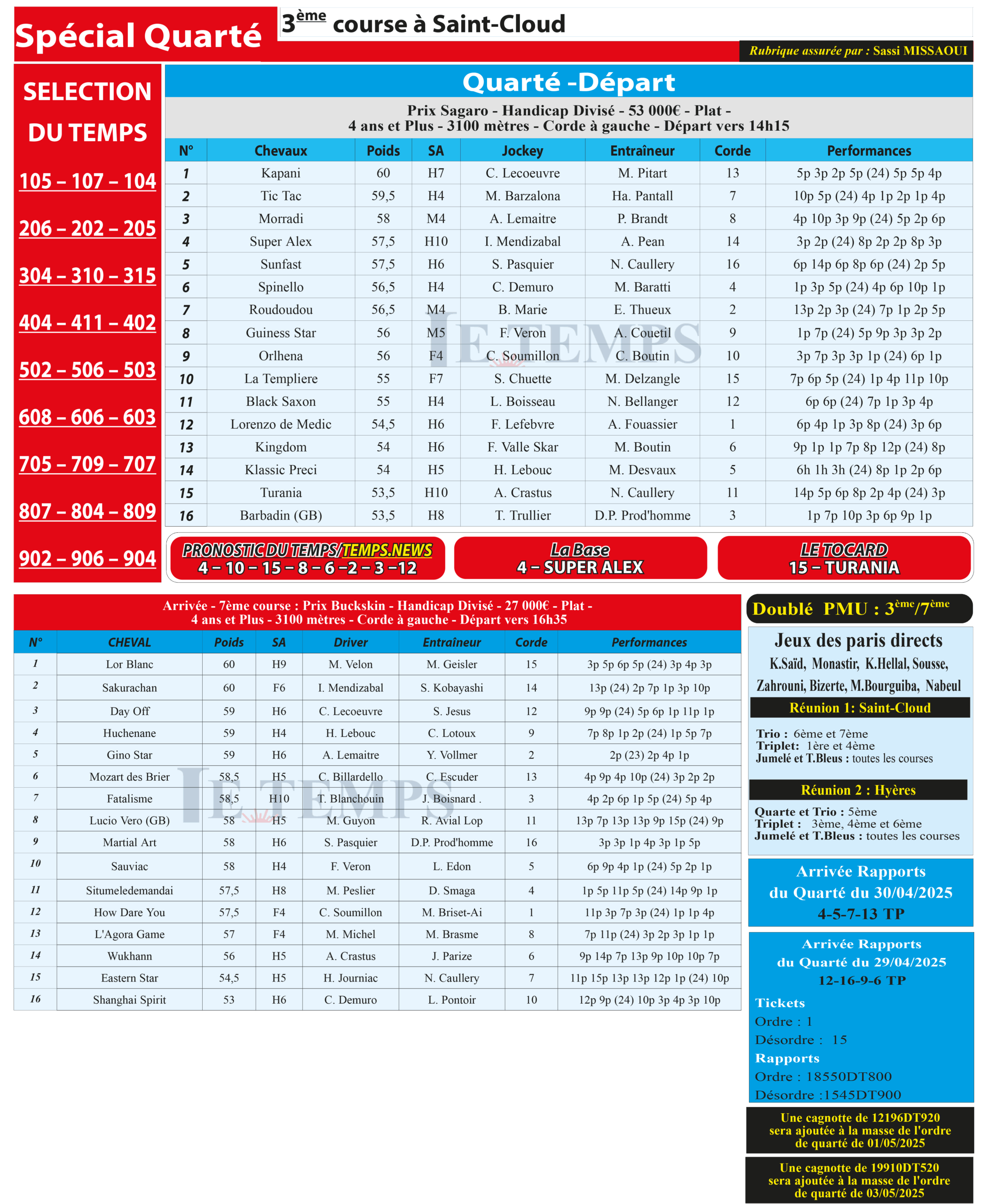 Notre spécial Quarté d’aujourd’hui, 3ème course à Saint-Cloud, donne notre pronostic du Temps/ Temps News avec le cheval n°4 Super Alex étant la base, tandis que le Tocard est le cheval n°15 Turania.