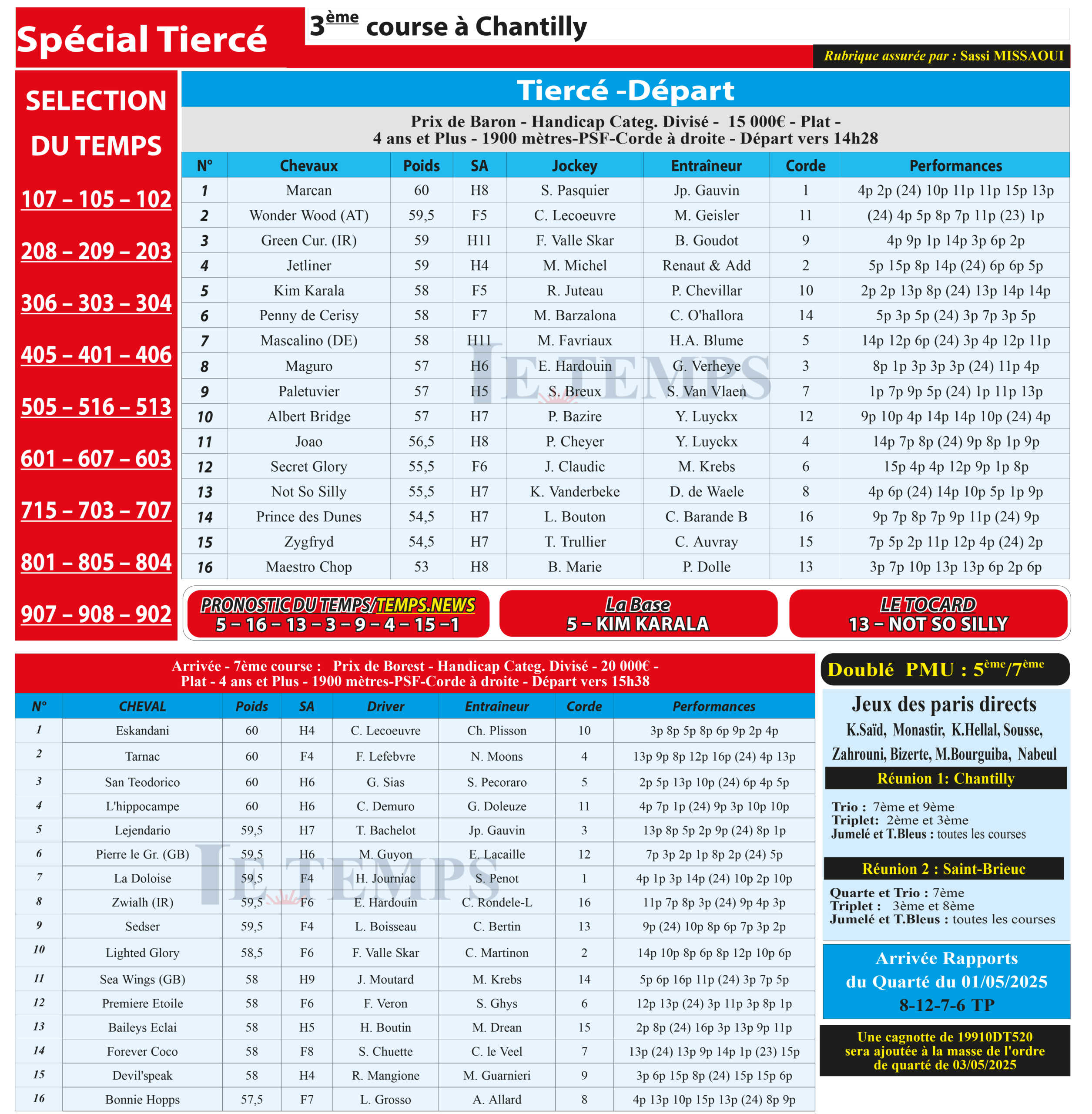 Notre spécial Tiercé d’aujourd’hui, 5ème course à Chantilly, donne notre pronostic du Temps/ Temps News avec le cheval n°5 Kim Karala étant la base, tandis que le Tocard est le cheval n°13 Not So Silly.