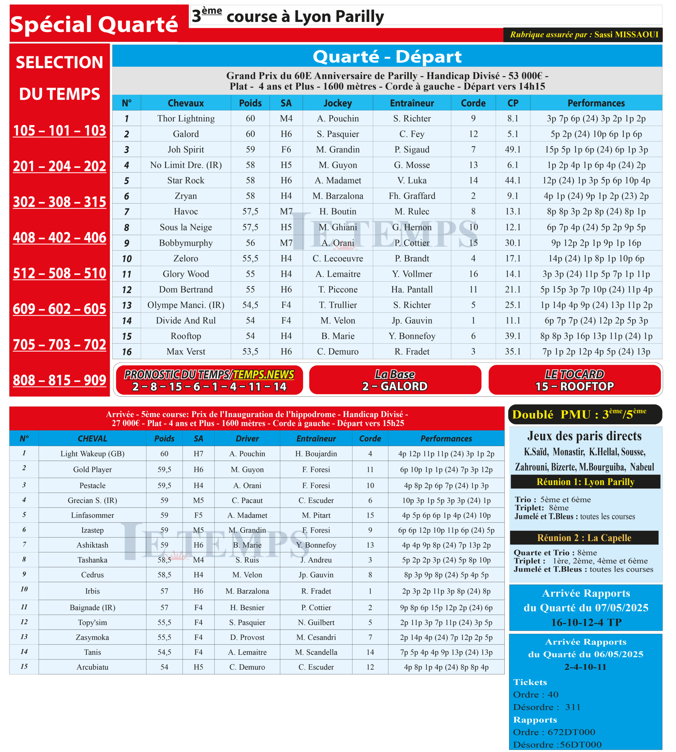 Partager Facebook Twitter LinkedIn Pinterest Email Notre spécial Quarté d’aujourd’hui, 3ème course à Lyon Parilly, donne notre pronostic du Temps/ Temps News avec le cheval n°2 Galord étant la base, tandis que le Tocard est le cheval n°15 Rooftop. PMU Turf
