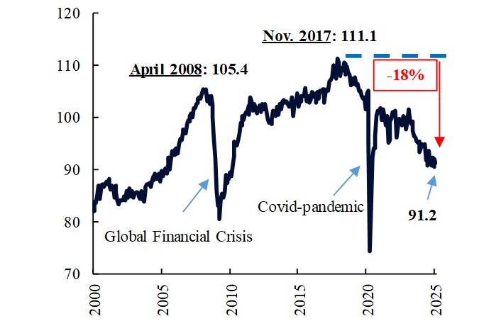 Depuis son pic en 2017, la production industrielle allemande a reculé de 18 %. En 2025, les nouvelles guerres commerciales lancées par l’administration Trump, conjuguées à l’incertitude géopolitique élevée, exerceront une pression supplémentaire sur les industries tournées vers l’exportation. Même si le secteur manufacturier devrait bénéficier des investissements dans les infrastructures et la défense, le nouveau gouvernement devra assurer un environnement plus stable pour compenser ces vents contraires majeurs.