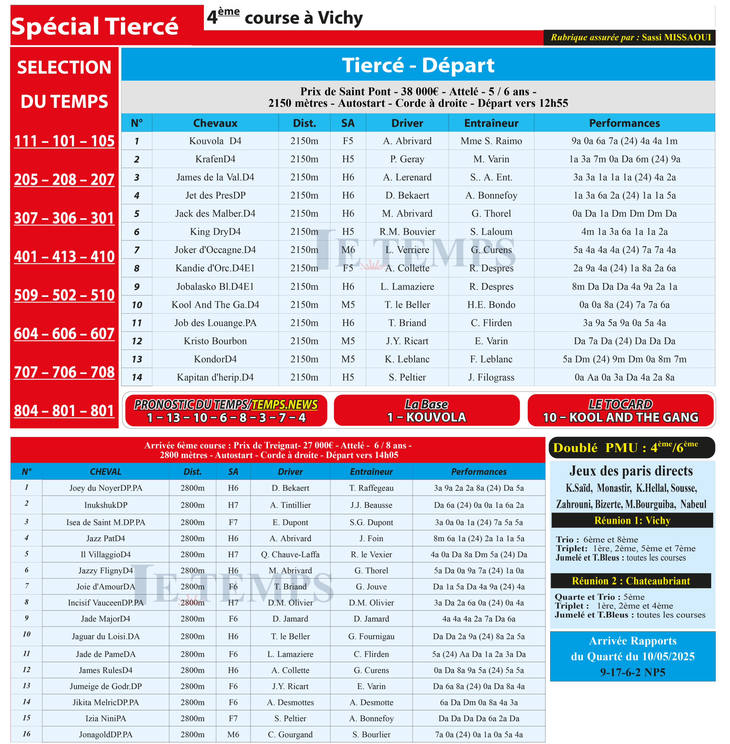 Notre spécial Tiercé d’aujourd’hui, 4ème course à Vichy, donne notre pronostic du Temps/ Temps News avec le cheval n°1 Kouvola étant la base, tandis que le Tocard est le cheval n°10 Kool And The Gang.