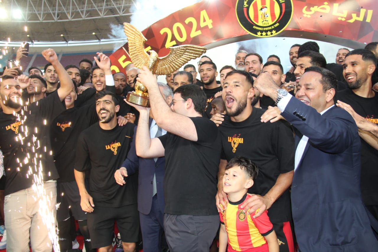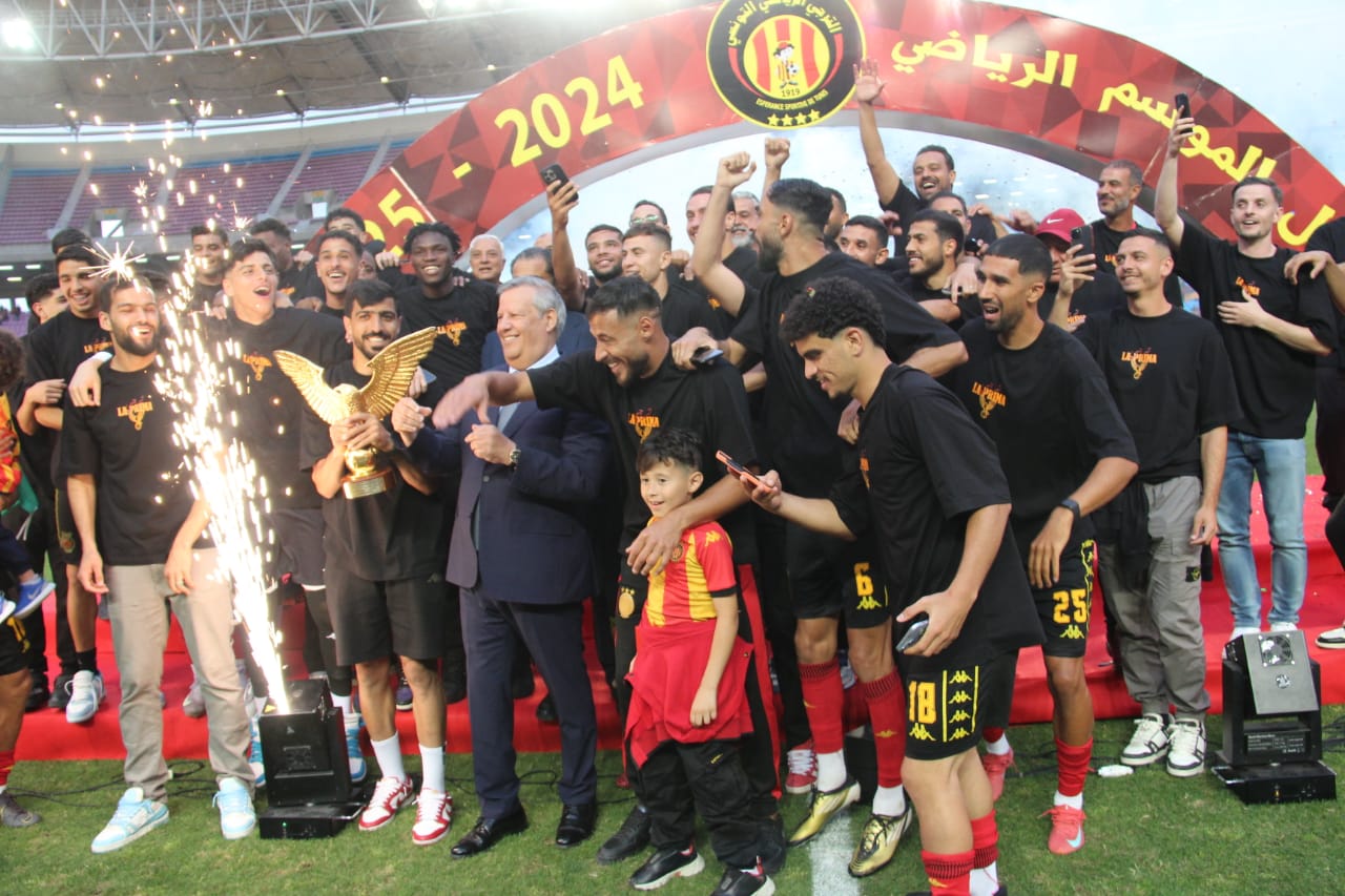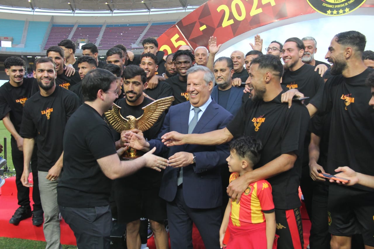 Au coup de sifflet final de la rencontre, Les joueurs de l’Espérance, ceux qui étaient sur le terrain et ceux qui étaient sur les gardins ont défilé à la tribune d’honneur pour recevoir les médailles commémoratives avant la remise du trophée au capitaine de l’équipe, Mohamed Amine Ben Hmida des mains de Sadok Mourali, le Ministre de la Jeunesse et des Sports en présence de Moez Nasri, le président de la Fédération Tunisienne de Football.