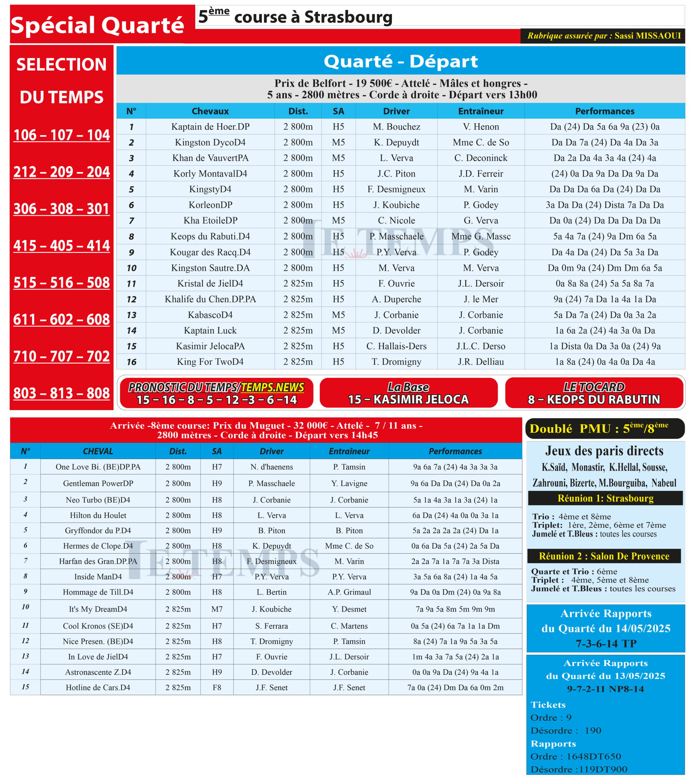 Notre spécial Quarté d’aujourd’hui, 5ème course à Strasbourg, donne notre pronostic du Temps/ Temps News avec le cheval n°15 Kasimir Jeloca étant la base, tandis que le Tocard est le cheval n°8 Keops Du Rabutin.