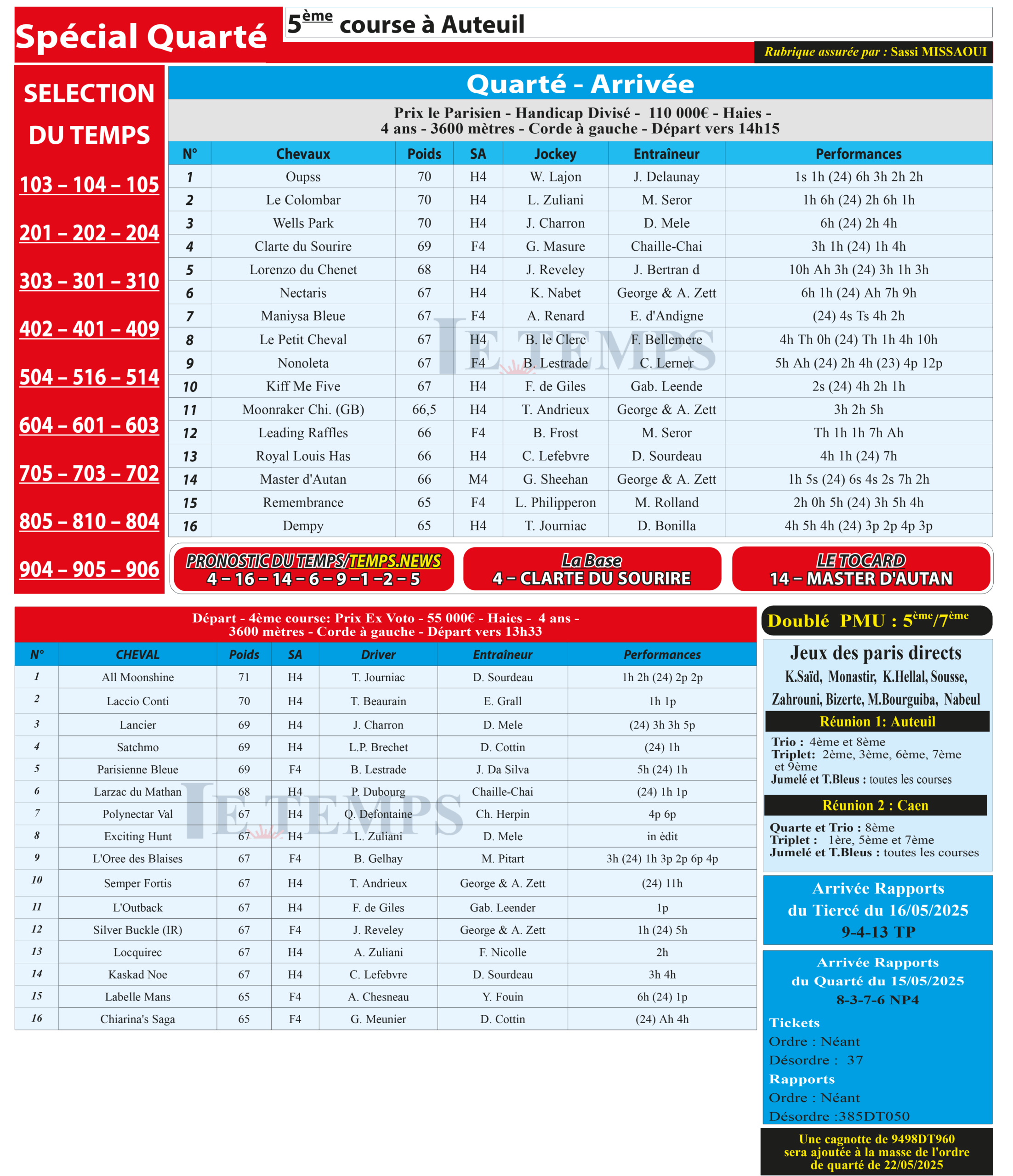 Partager Facebook Twitter LinkedIn Pinterest Email Notre spécial Quarté d’aujourd’hui, 5ème course à Auteuil, donne notre pronostic du Temps/ Temps News avec le cheval n°4 Clarte Du Sourire étant la base, tandis que le Tocard est le cheval n°14 Master D’Autan. PMU Turf