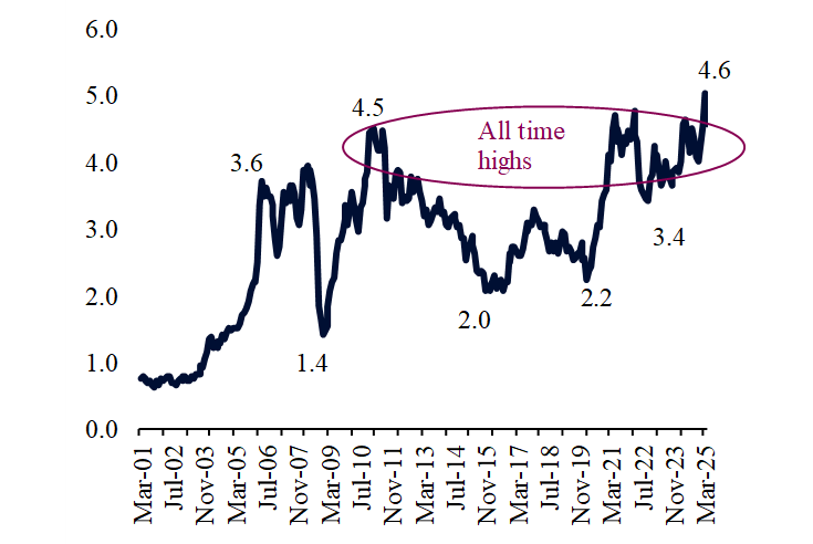 Les prix du cuivre ont clairement franchi leur fourchette de négociation historique, s’établissant désormais autour de 4,6 USD la livre – une nette progression au-delà des sommets précédents observés à la fois après la crise financière mondiale et lors du boom des investissements post-Covid.