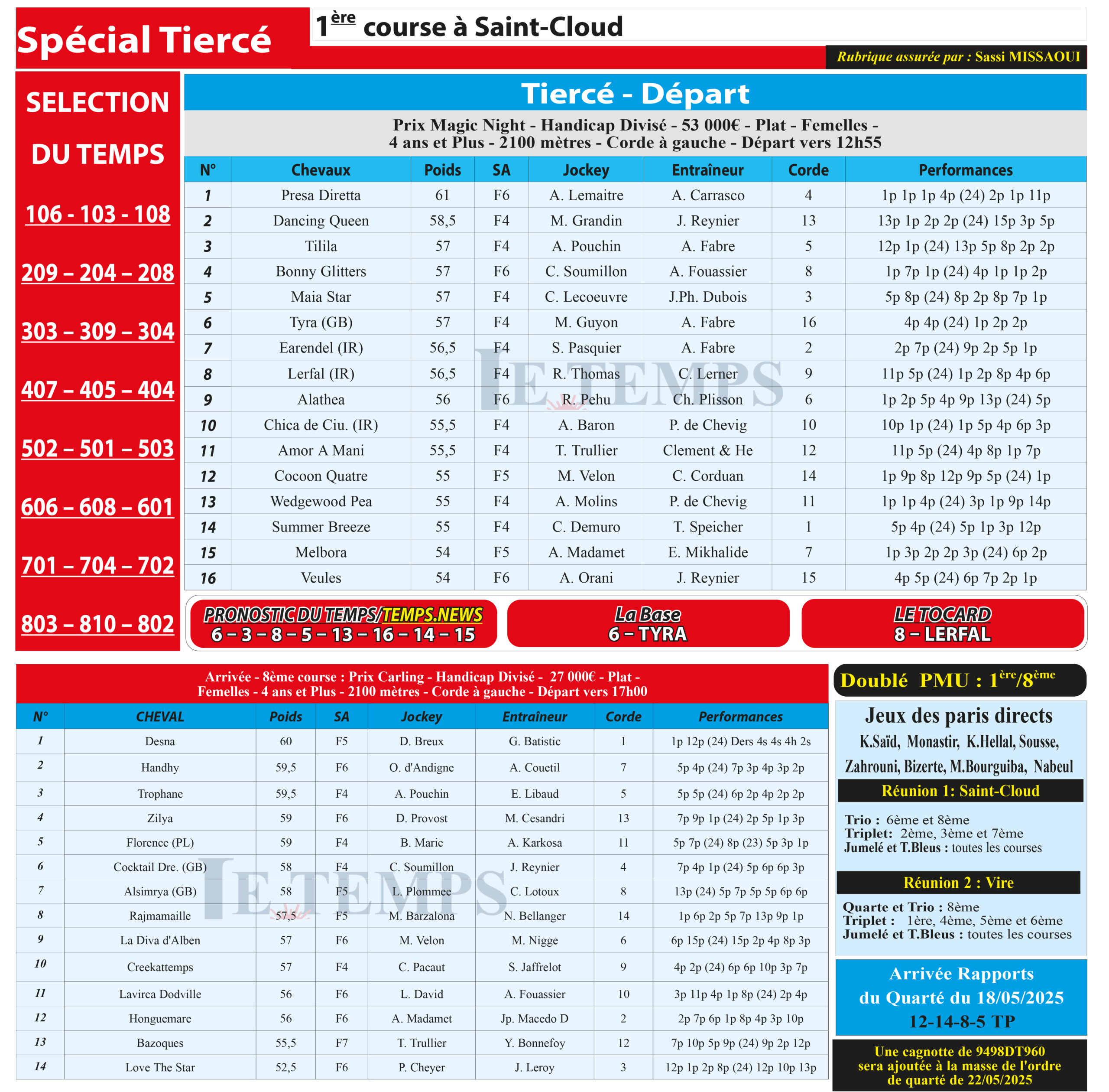 Partager Facebook Twitter LinkedIn Pinterest Email Notre spécial Tiercé d’aujourd’hui, 1ère course à Saint-Cloud, donne notre pronostic du Temps/ Temps News avec le cheval n°6 Tyra étant la base, tandis que le Tocard est le cheval n°8 Lerfal. PMU Turf