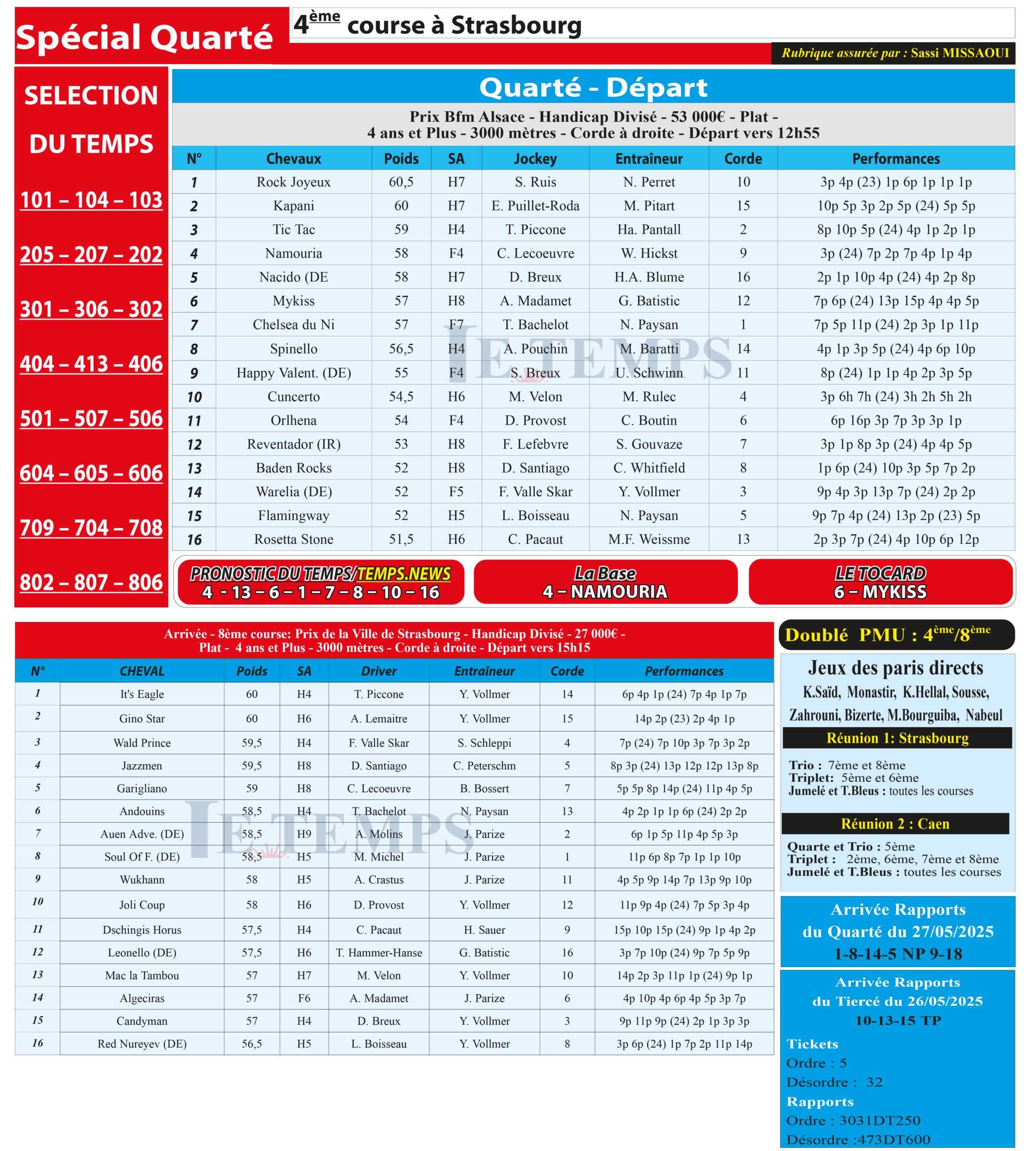 Partager Facebook Twitter LinkedIn Pinterest Email Notre spécial Quarté d’aujourd’hui, 4ème course à Strasbourg, donne notre pronostic du Temps/ Temps News avec le cheval n°4 Namouria étant la base, tandis que le Tocard est le cheval n°6 Mykiss. PMU Turf