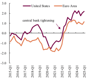Les conditions financières sont restées plus strictes que prévu, augmentant les coûts d’endettement pour les entreprises et les consommateurs. Les rendements souverains dans les EA ont commencé à augmenter avec les cycles de resserrement de la politique monétaire des principales banques centrales en 2022. Malgré les premières baisses de taux initiées par la Réserve fédérale américaine et la Banque centrale européenne, les rendements à long terme sont restés élevés, en raison de l’augmentation des émissions d’obligations gouvernementales, des inquiétudes renouvelées concernant l’inflation et des perturbations induites par la politique sur les marchés du Trésor américain. En conséquence, les rendements des obligations gouvernementales à long terme ajustés de l’inflation, qui déterminent les coûts d’endettement réels, restent proches de leurs niveaux les plus élevés depuis plus d’une décennie dans les principales EA. En outre, les écarts de rendement entre les obligations d’entreprises à haut rendement et la dette publique à long terme se sont élargis. Des rendements réels à long terme plus élevés et des écarts plus larges créent des vents contraires supplémentaires pour la croissance économique, car les coûts d’emprunt pèsent sur l’investissement et la consommation.