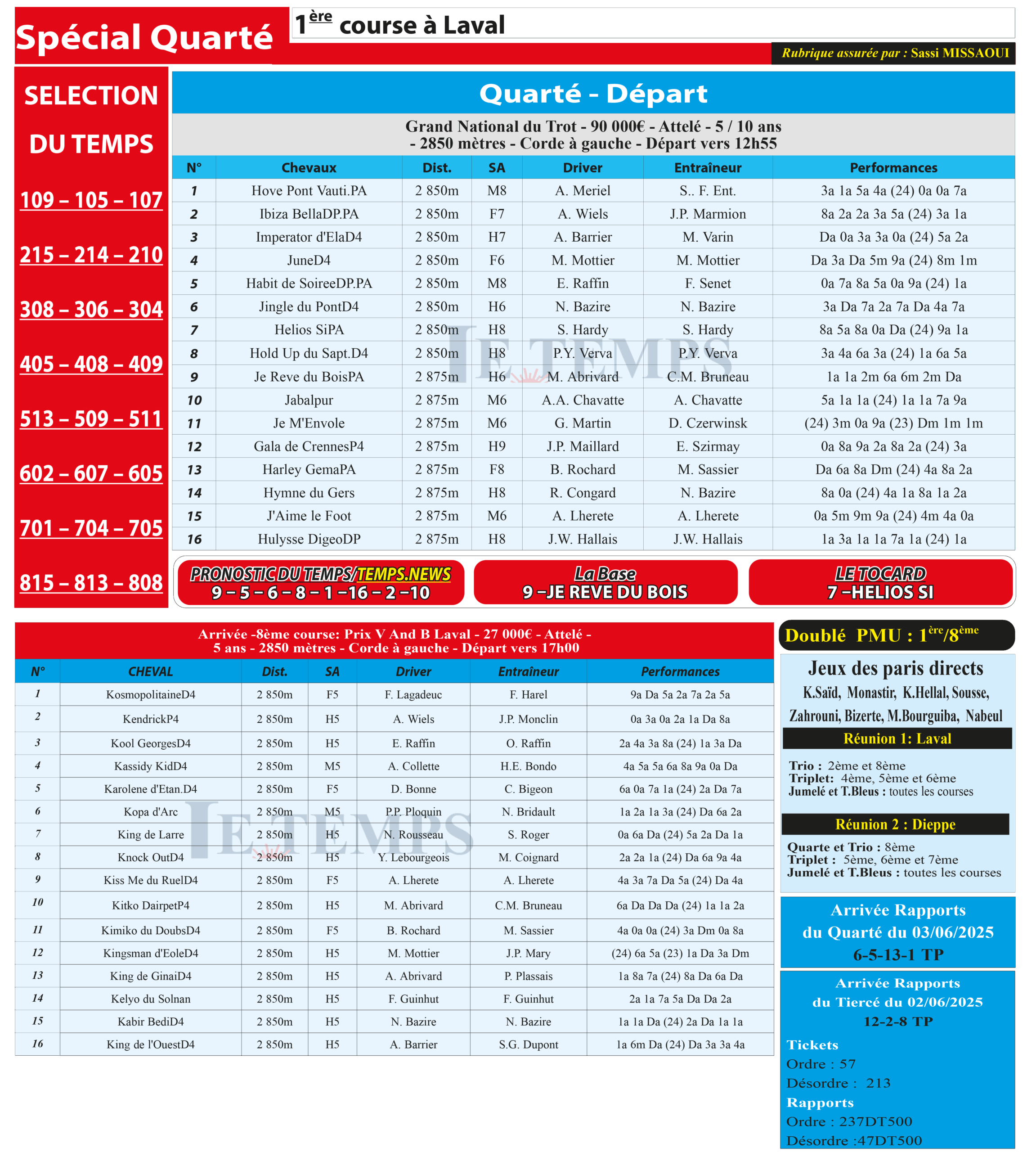 Partager Facebook Twitter LinkedIn Pinterest Email Notre spécial Quarté d’aujourd’hui, 1ère course à Laval, donne notre pronostic du Temps/ Temps News avec le cheval n°9 Je Rêve Du Bois étant la base, tandis que le Tocard est le cheval n°7 Hélios Si. PMU Turf