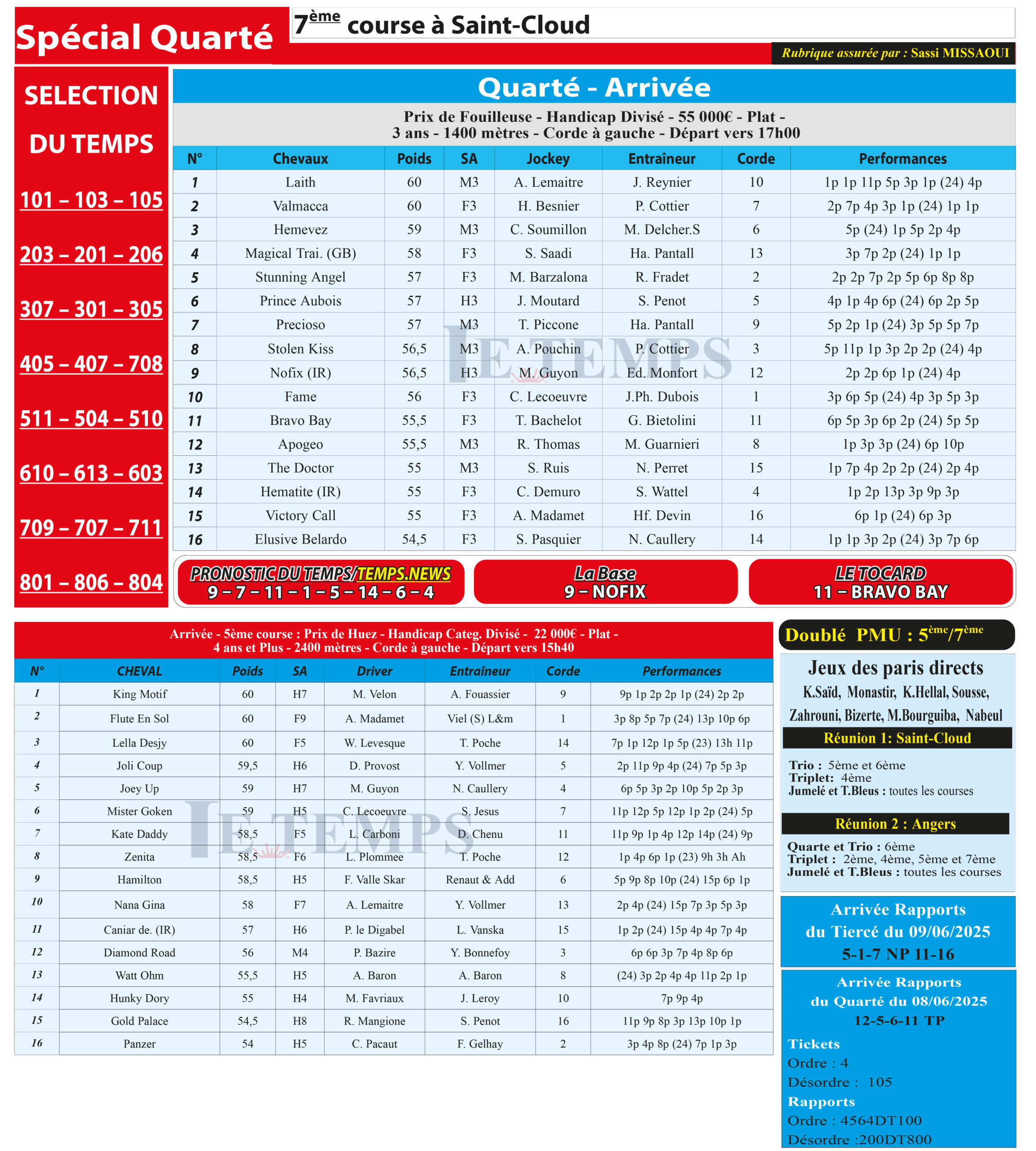 Partager Facebook Twitter LinkedIn Pinterest Email Notre spécial Quarté d’aujourd’hui, 7ème course à Saint-Cloud, donne notre pronostic du Temps/ Temps News avec le cheval n°9 Nofix étant la base, tandis que le Tocard est le cheval n°11 Bravo Bay. PMU Turf