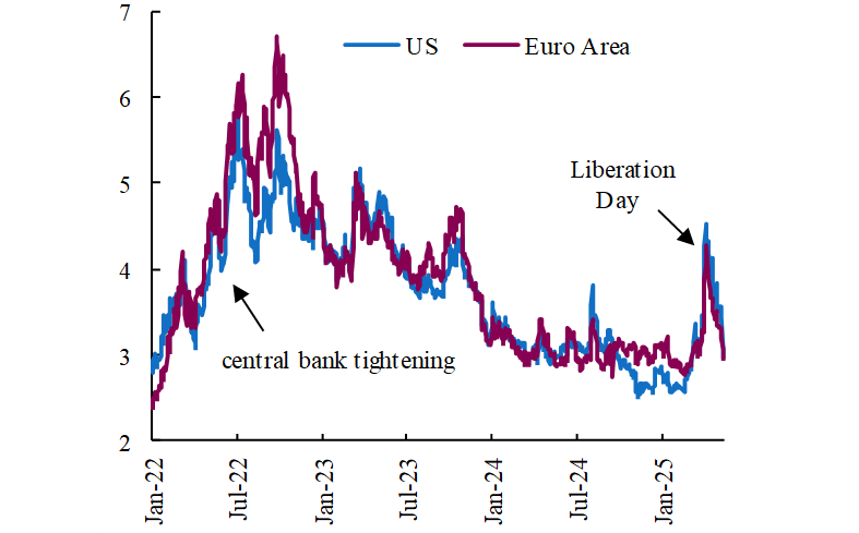 Troisièmement, après une correction significative suivant le Jour de la Libération, les marchés boursiers ont connu une reprise notable, soutenue par des bénéfices d’entreprise résilients et les attentes d’un assouplissement monétaire. Par ailleurs, les attentes du marché se sont ajustées sur la base de l’hypothèse que les menaces initiales de tarifs ont constitué le point de départ de négociations. Aux États-Unis, les principaux indices ont retrouvé leurs sommets précédents, reflétant une confiance accrue dans un scénario d’atterrissage en douceur et les perspectives de baisses de taux, ainsi que des résultats meilleurs que prévu dans des secteurs clés. En Europe, l’indice MSCI Europe a été l’un des meilleurs indices régionaux cette année, augmentant de près de 20 % en dollars, grâce à un coup de pouce lié au changement historique de politique budgétaire de l’Allemagne et à l’atténuation des pressions sur les prix de l’énergie. À l’avenir, sauf en cas de nouvelle escalade majeure des représailles commerciales ou d’un regain de crainte d’atterrissage brutal, l’environnement devrait rester favorable aux actions dans les principales économies avancées.