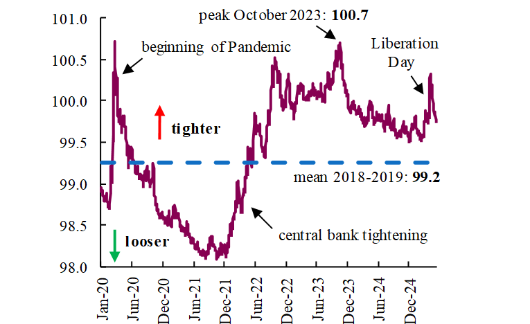 L’indice des conditions financières (FCI) fournit un résumé informatif de l’état global des marchés dans les économies avancées. Le FCI a grimpé après le Jour de la Libération, atteignant brièvement des niveaux typiquement associés à des périodes de stress, interrompant la tendance antérieure à l’assouplissement des conditions. À notre avis, ces perturbations du marché s’avéreront temporaires, et les conditions financières devraient s’améliorer et reprendre une tendance plus favorable. Nous examinons les trois principaux facteurs qui soutiennent notre perspective.