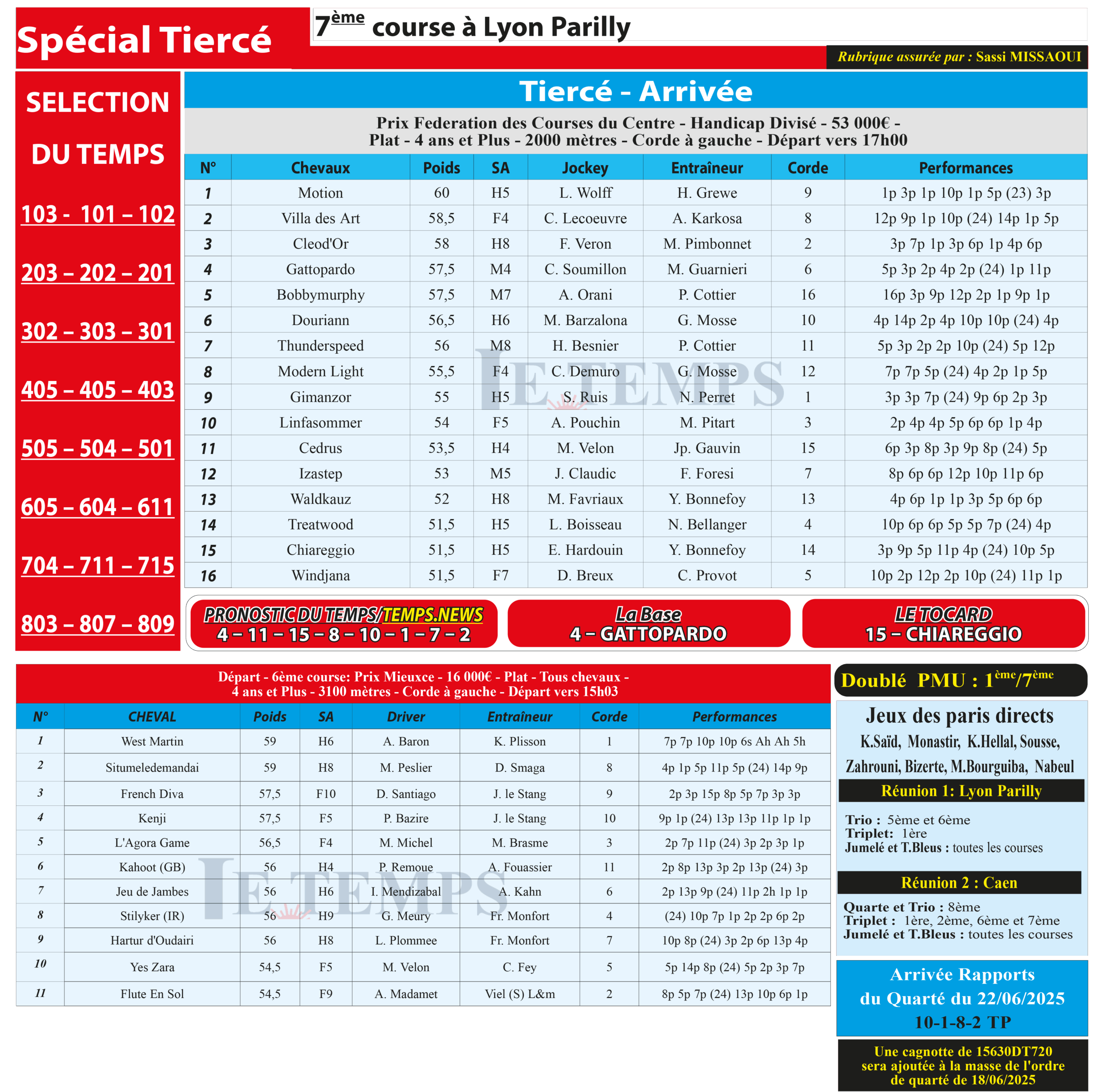 Partager Facebook Twitter LinkedIn Pinterest Email Notre spécial Tiercé d’aujourd’hui, 7ème course à Lyon Parilly, donne notre pronostic du Temps/ Temps News avec le cheval n°4 Gattopardo étant la base, tandis que le Tocard est le cheval n°15 Chiareggio. PMU Turf