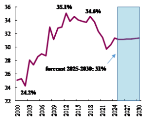 Troisièmement, l’Indonésie continue de développer un portefeuille solide de projets d’infrastructure à grande échelle et d’investissement en capital (CAPEX) qui soutiendra les flux d’investissements et renforcera la capacité de production. L’investissement dans les infrastructures devrait rester l’une des principales priorités de la nouvelle administration. D’importants projets sont en cours dans des secteurs tels que les transports (routes, chemins de fer, aéroports et ports), l’énergie (y compris les énergies renouvelables et une grande raffinerie), ainsi que les infrastructures nécessaires au fonctionnement de nouvelles usines de fabrication. De plus, le fonds souverain nouvellement lancé, Danantara, a reçu le mandat de cibler des projets dans le traitement des ressources naturelles et le développement de l’intelligence artificielle. L’investissement public viendra renforcer le maintien d’un niveau sain d’investissement global, qui devrait rester supérieur à 30 % du PIB et contribuer à un rythme de croissance économique soutenu.