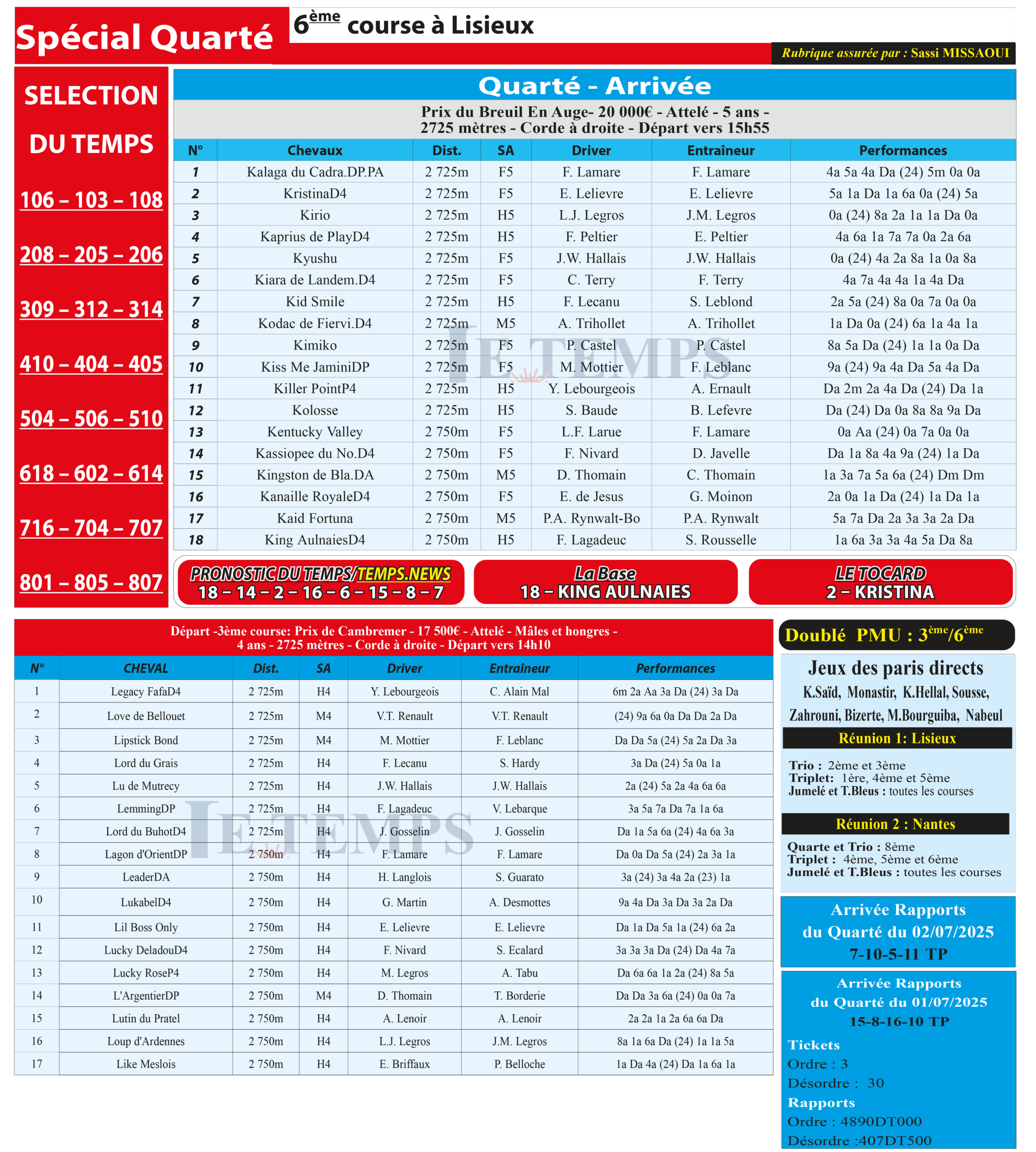Notre spécial Quarté d’aujourd’hui, 6ème course à Lisieux, donne notre pronostic du Temps/ Temps News avec le cheval n°18 King Aulnaies étant la base, tandis que le Tocard est le cheval n°2 Kristina.