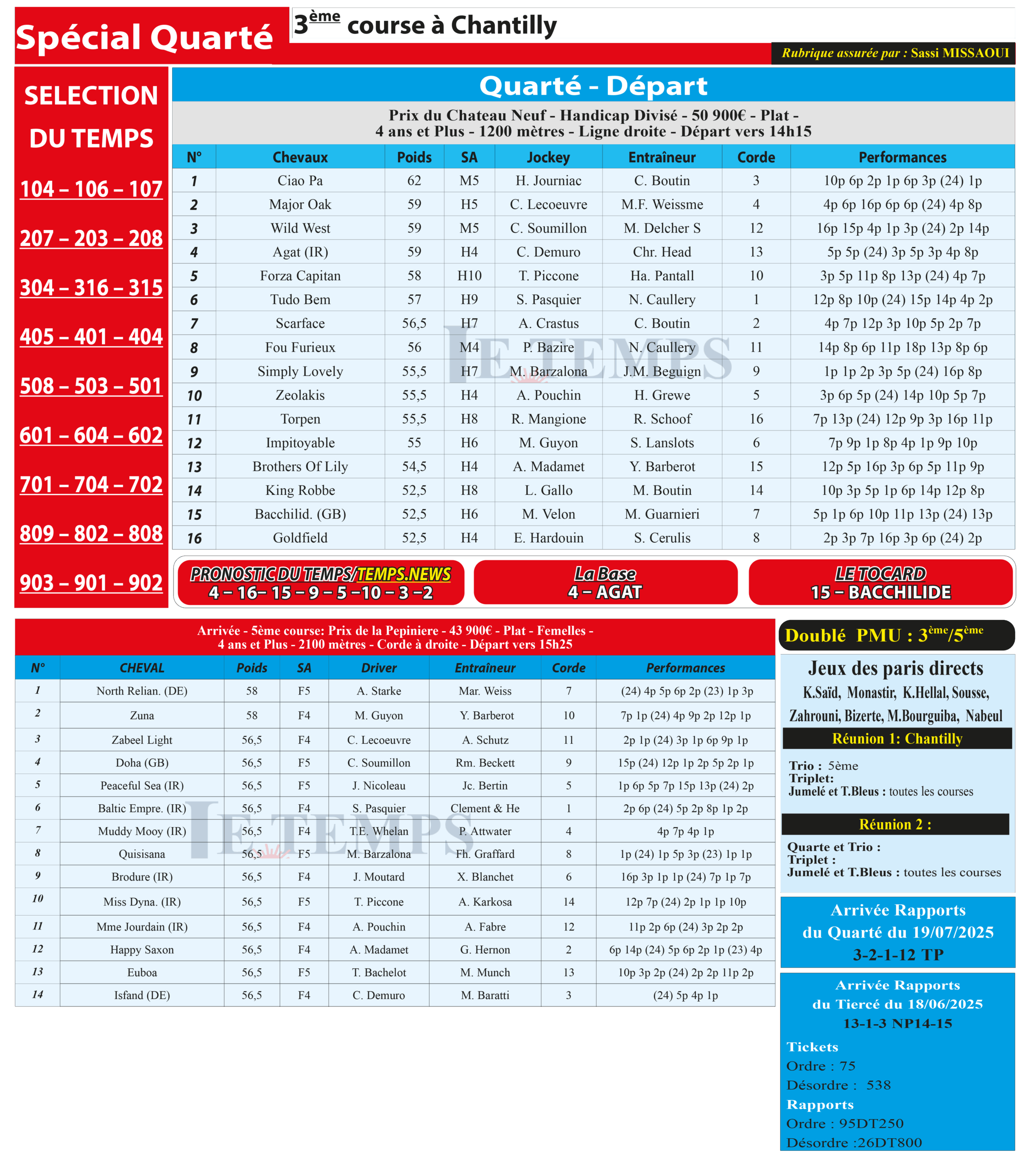 Partager Facebook Twitter LinkedIn Pinterest Email Notre spécial Quarté d’aujourd’hui, 3ème course à Chantilly, donne notre pronostic du Temps/ Temps News avec le cheval n°4 Agat étant la base, tandis que le Tocard est le cheval n°15 Bacchilide. PMU Turf