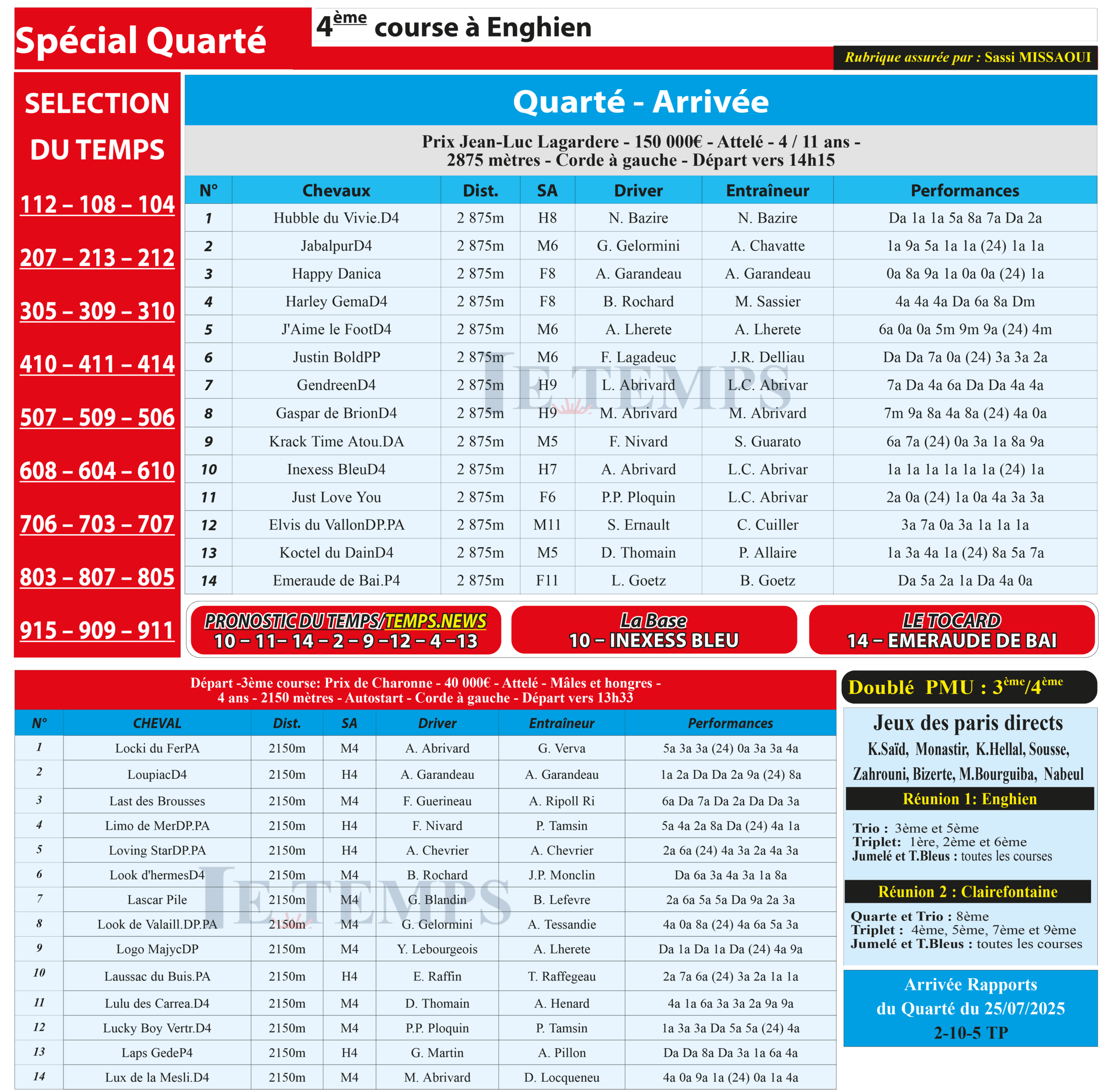 Partager Facebook Twitter LinkedIn Pinterest Email Notre spécial Quarté d’aujourd’hui, 4ème course à Enghien, donne notre pronostic du Temps/ Temps News avec le cheval n°10 Inexess Bleu étant la base, tandis que le Tocard est le cheval n°14 Emeraude De Bai. PMU Turf
