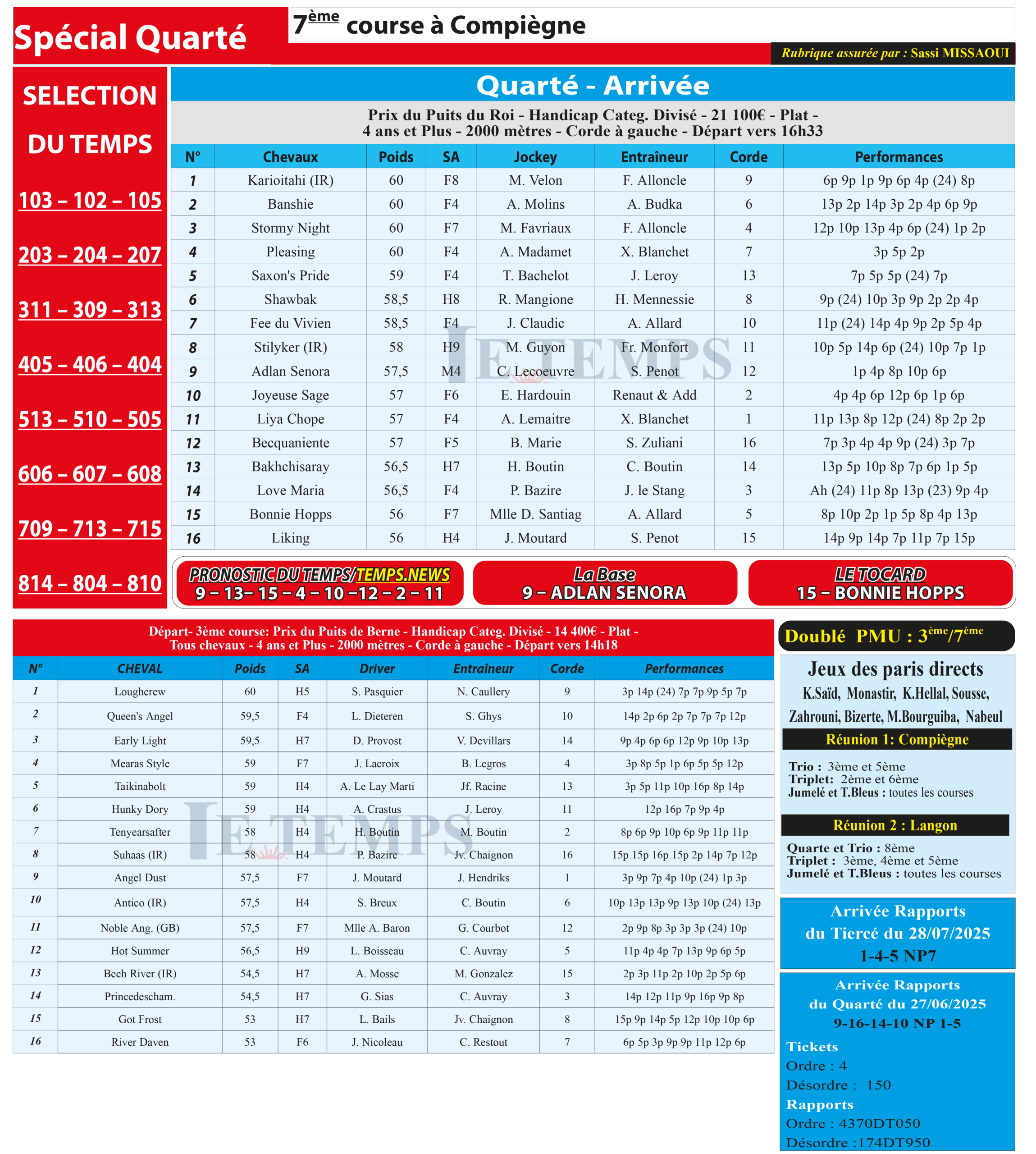 Partager Facebook Twitter LinkedIn Pinterest Email Notre spécial Quarté d’aujourd’hui, 7ème course à Compiègne, donne notre pronostic du Temps/ Temps News avec le cheval n°9 Adlan Senora étant la base, tandis que le Tocard est le cheval n°15 Bonnie Hopps. PMU Turf