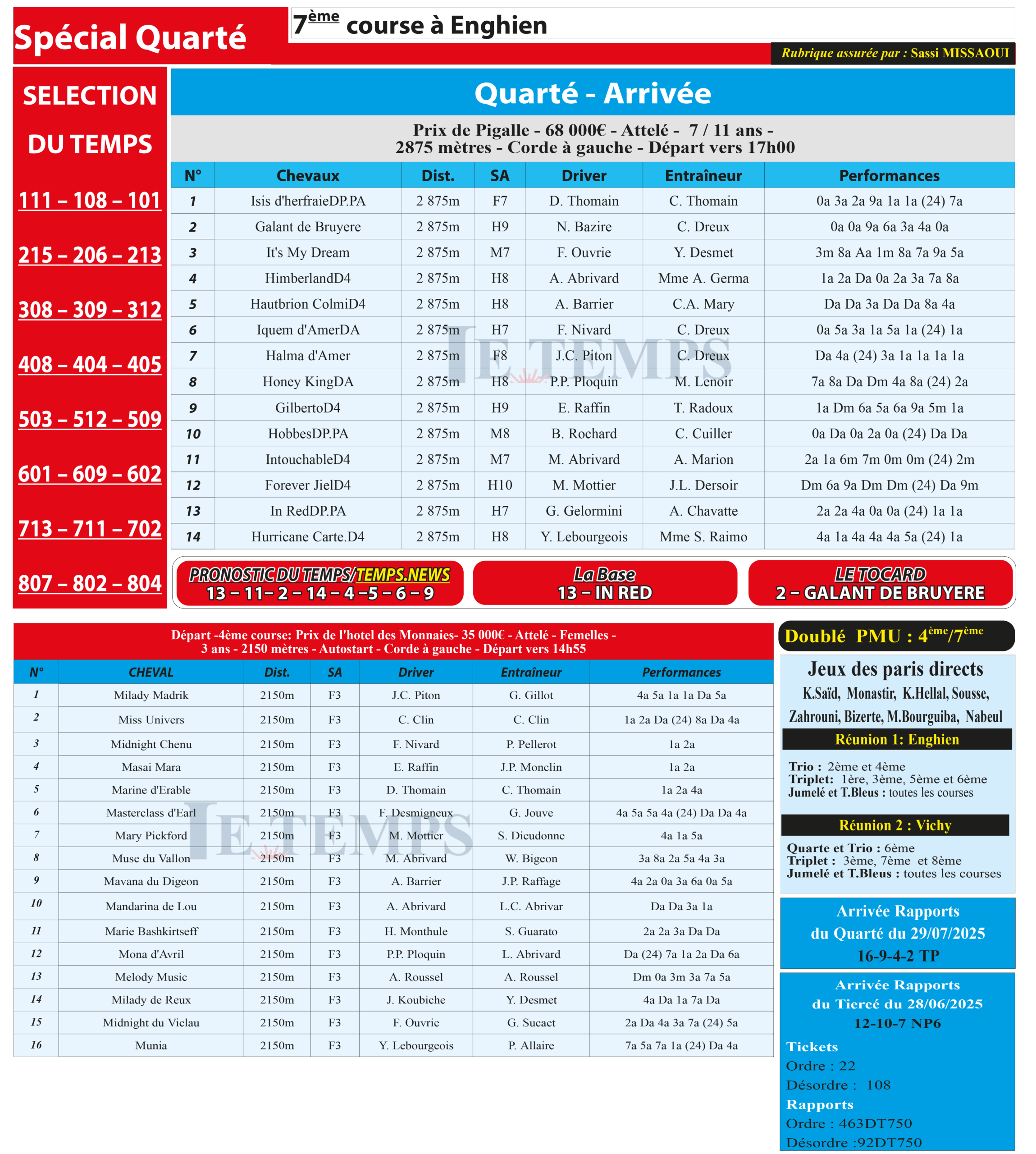 Partager Facebook Twitter LinkedIn Pinterest Email Notre spécial Quarté d’aujourd’hui, 7ème course à Enghien, donne notre pronostic du Temps/ Temps News avec le cheval n°13 In Red étant la base, tandis que le Tocard est le cheval n°2 Galant De Bruyere. PMU Turf