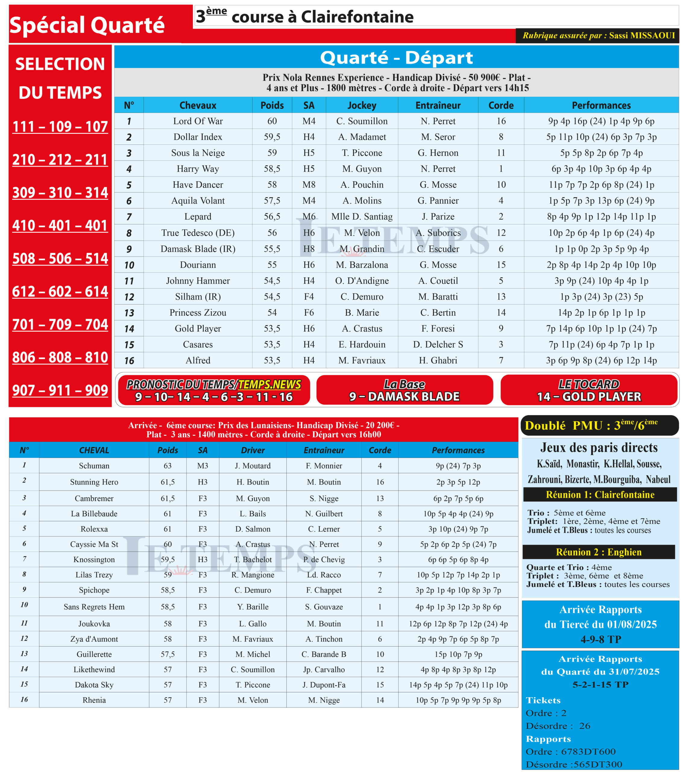 Partager Facebook Twitter LinkedIn Pinterest Email Notre spécial Quarté d’aujourd’hui, 3ème course à Clairefontaine, donne notre pronostic du Temps/ Temps News avec le cheval n°9 Damask Blade étant la base, tandis que le Tocard est le cheval n°14 Gold Player. PMU Turf