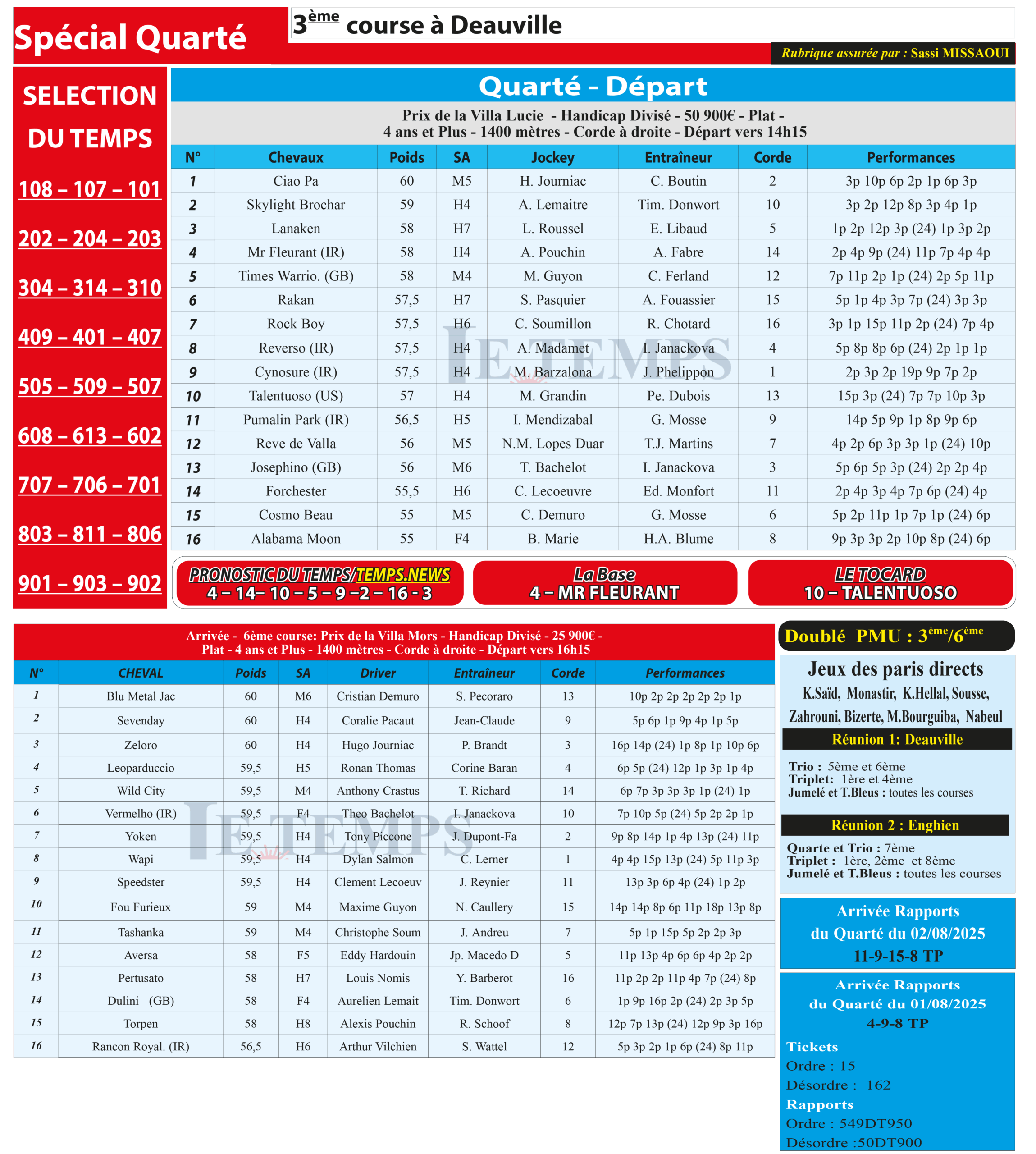 Notre spécial Quarté d’aujourd’hui, 3ème course à Deauville, donne notre pronostic du Temps/ Temps News avec le cheval n°4 Mr Fleurant étant la base, tandis que le Tocard est le cheval n°10 Talentuoso.
