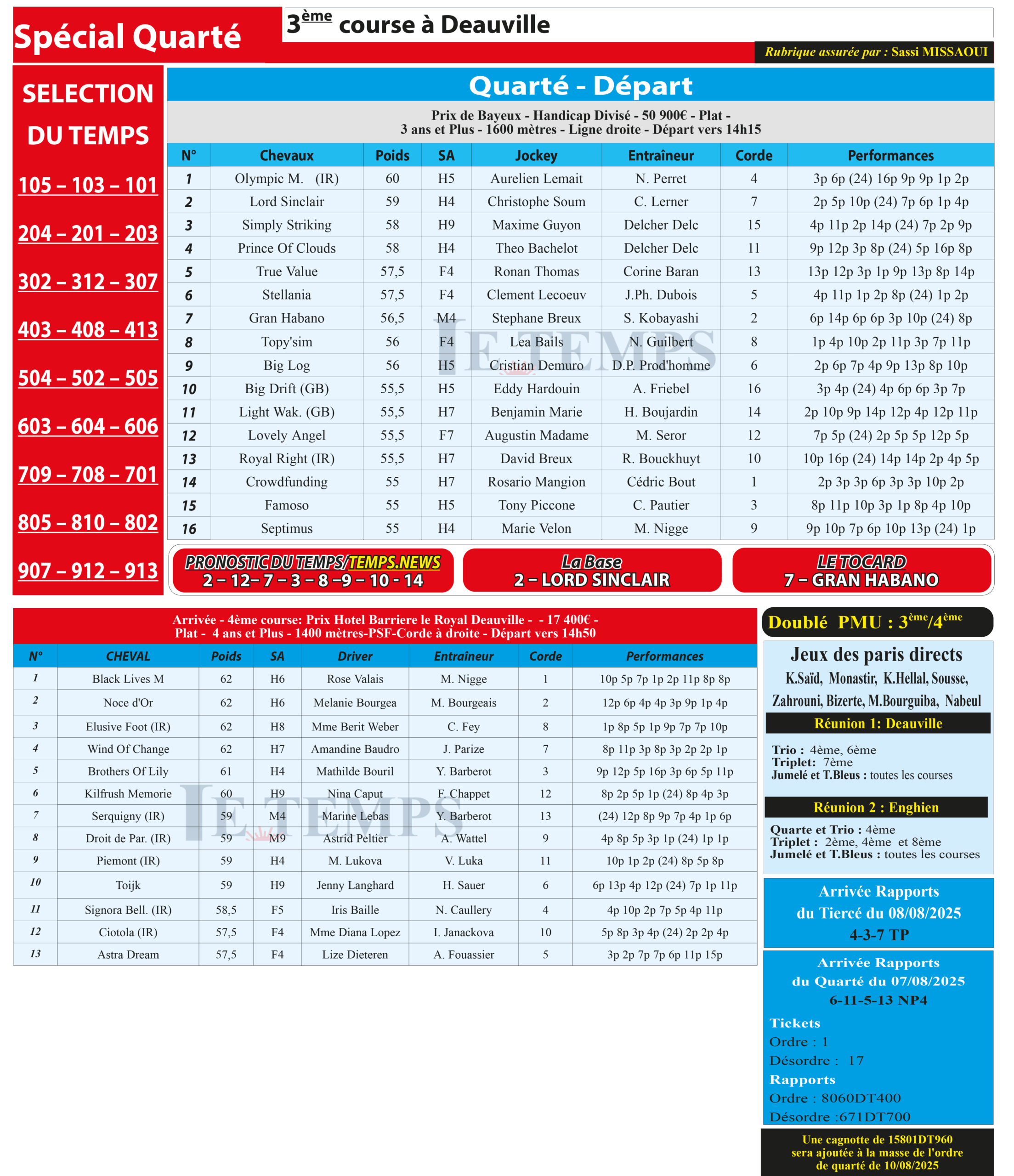 Partager Facebook Twitter LinkedIn Pinterest Email Notre spécial Quarté d’aujourd’hui, 3ème course à Deauville, donne notre pronostic du Temps/ Temps News avec le cheval n°2 Lord Sinclairétant la base, tandis que le Tocard est le cheval n°7 Gran Habano. PMU Turf