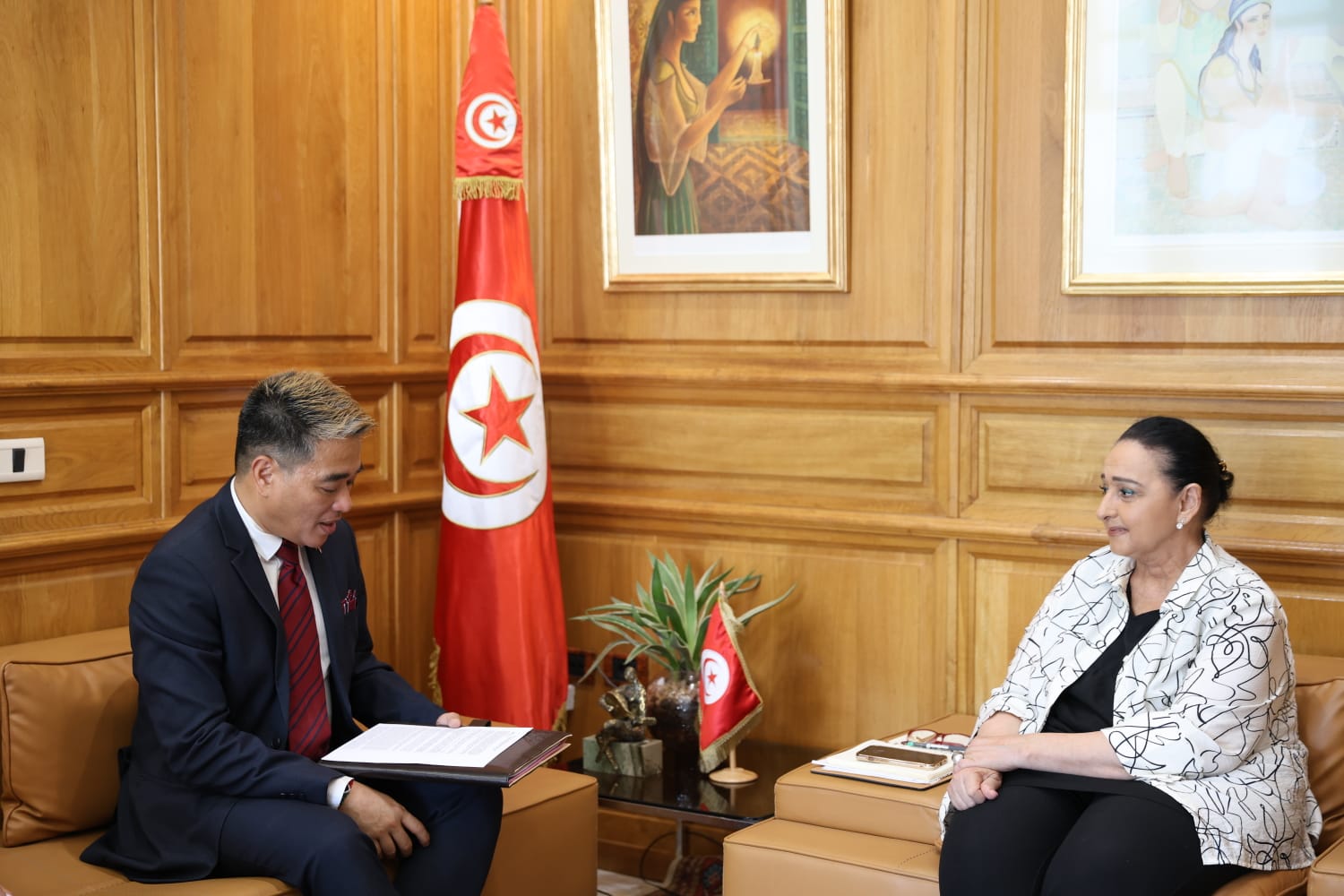 La ministre des Affaires culturelles, Amina Srarfi, a rencontré à Tunis le chargé d’affaires de l’Ambassade des Philippines, Roderico C. Atienz, afin de renforcer la coopération culturelle et humaine entre les deux pays. Les discussions ont porté sur l’organisation d’événements célébrant le 50ᵉ anniversaire des relations diplomatiques, dont une Semaine culturelle tuniso-philippine comprenant des spectacles, des expositions et des rencontres. Les deux parties ont également abordé la coopération en matière de fouilles et de recherches archéologiques, l’échange d’expertises ainsi que le développement des arts, de la musique et de la danse, avec un accent particulier sur les arts populaires.