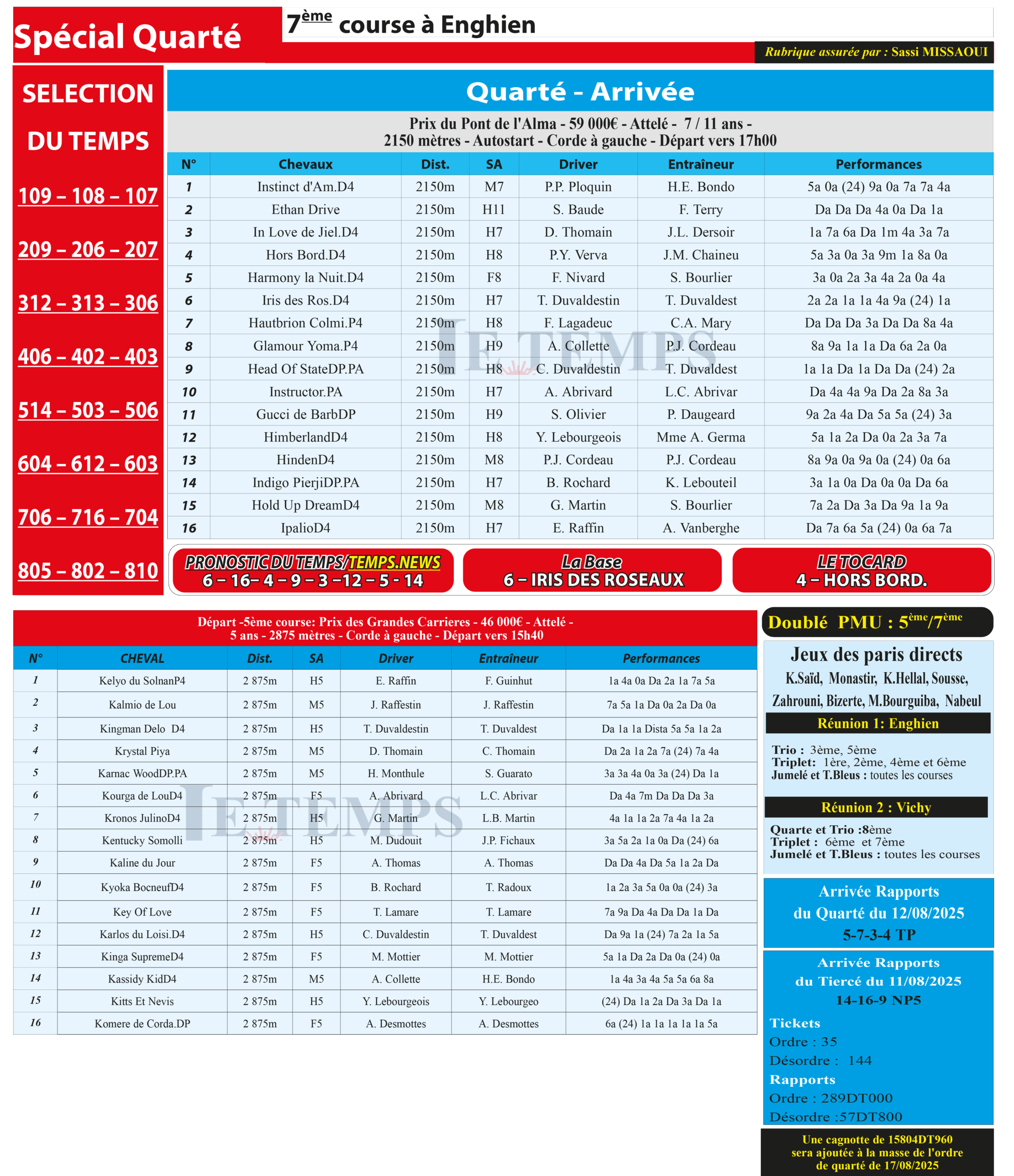 Partager Facebook Twitter LinkedIn Pinterest Email Notre spécial Quarté d’aujourd’hui, 7ème course à Enghien, donne notre pronostic du Temps/ Temps News avec le cheval n°6 Iris Des Roseaux étant la base, tandis que le Tocard est le cheval n°4 Hors Bord. PMU Turf