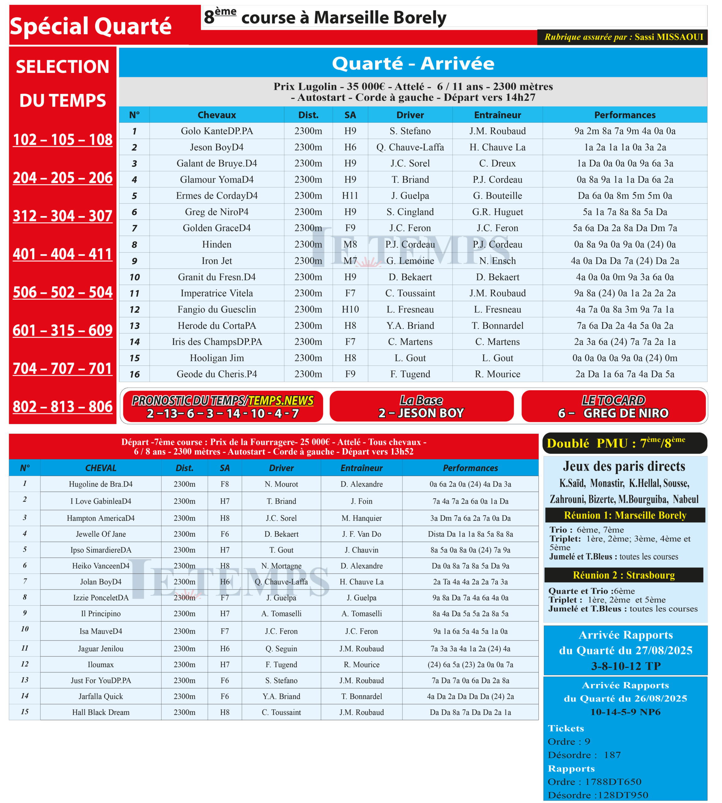 Partager Facebook Twitter LinkedIn Pinterest Email Notre spécial Quarté d’aujourd’hui, 8ème course à Marseille Borely, donne notre pronostic du Temps/ Temps News avec le cheval n°2 Jelson Boy la base, tandis que le Tocard est le cheval n°6 Greg De Niro. PMU Turf