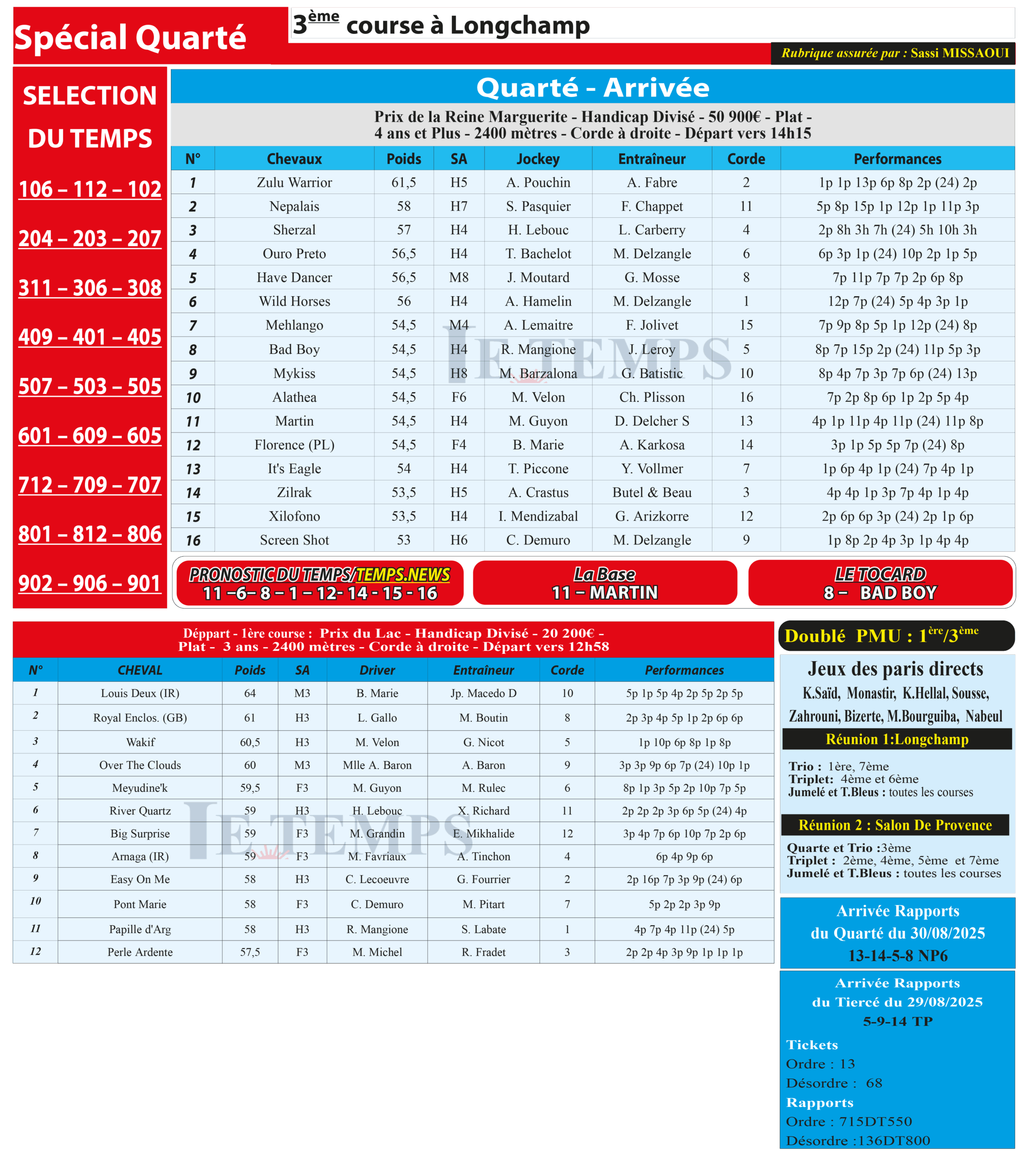Partager Facebook Twitter LinkedIn Pinterest Email Notre spécial Quarté d’aujourd’hui, 3ème course à Longchamp, donne notre pronostic du Temps/ Temps News avec le cheval n°11 Martin la base, tandis que le Tocard est le cheval n°8 Bad Boy. PMU Turf